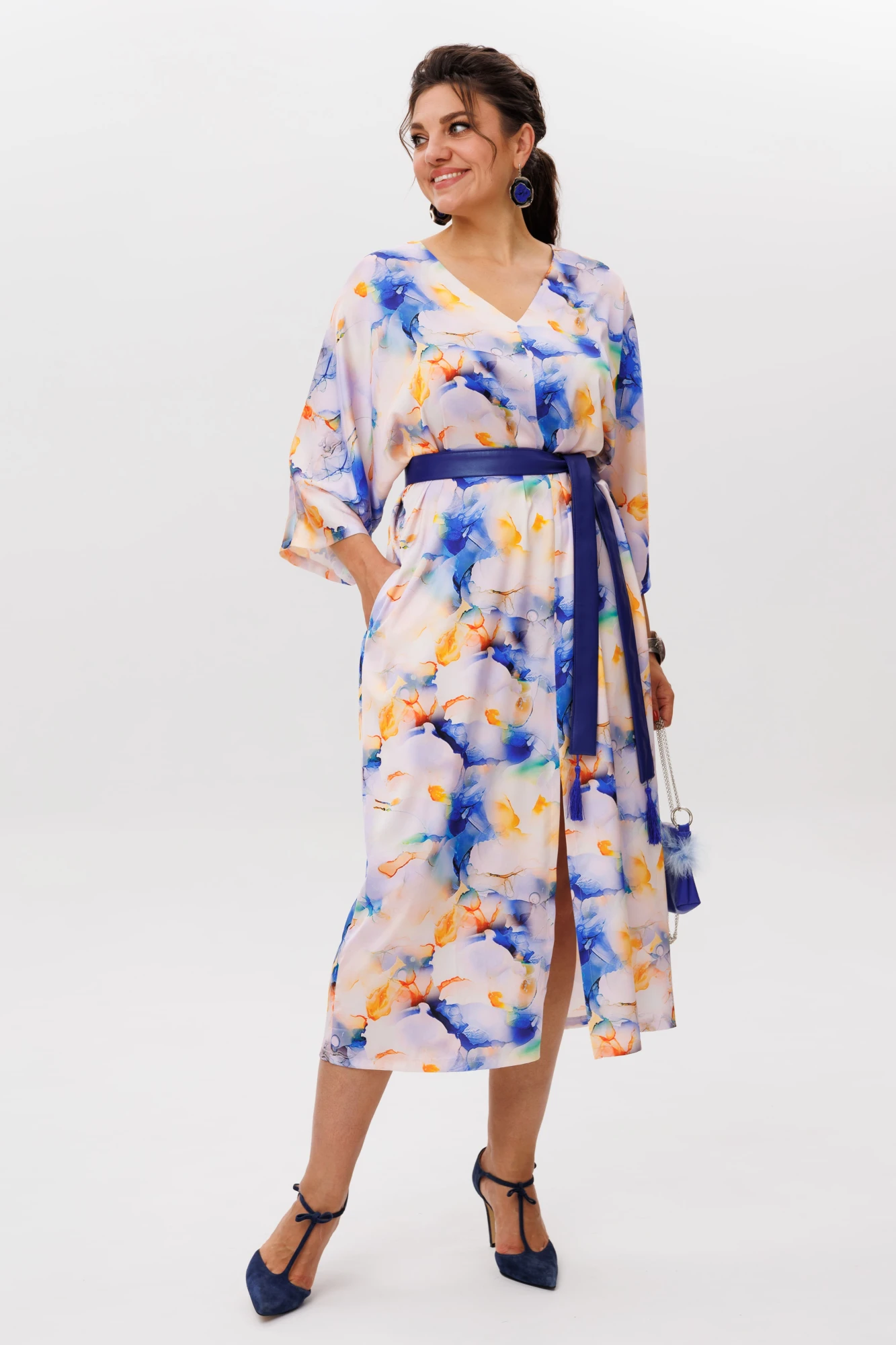 60, 62Глубокий V-образный вырез придает образу ноту изысканности, деликатно акцентируя благородные линии шеи и декольте. Передняя часть платья украшена выразительным средним швом, дополненным изящным разрезом, который придает наряду динамику и современное звучание.