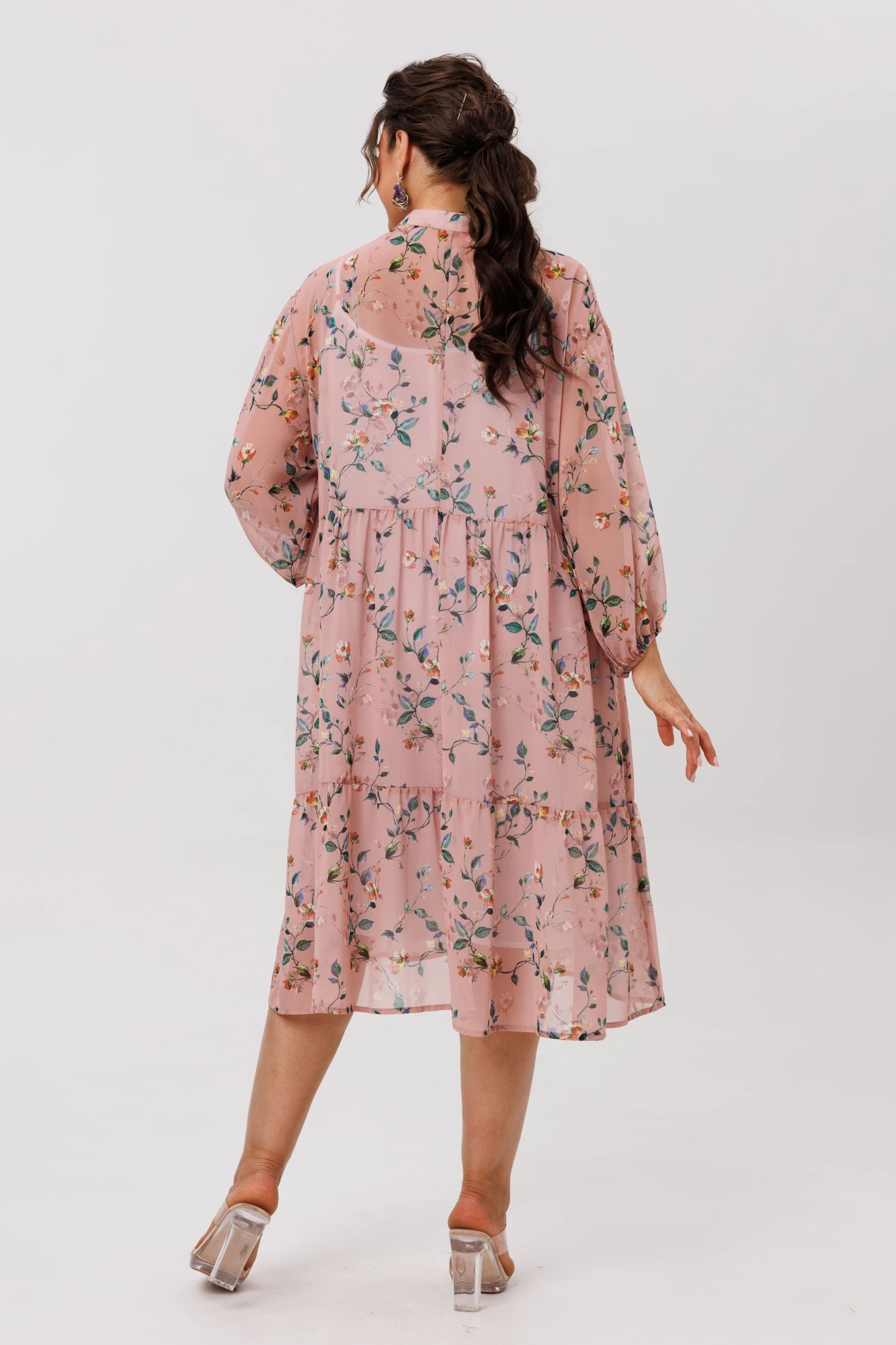 Аккуратный воротник-стойка и застёжка на пуговицы по планке добавляют образу утончённости и аккуратности, а свободный рукав на резинке по низу создаёт мягкий объём и лёгкую воздушность. Замеры сдвоенные. От линии талии расположены два волана, которые придают платью динамику и плавное движение при каждом шаге.