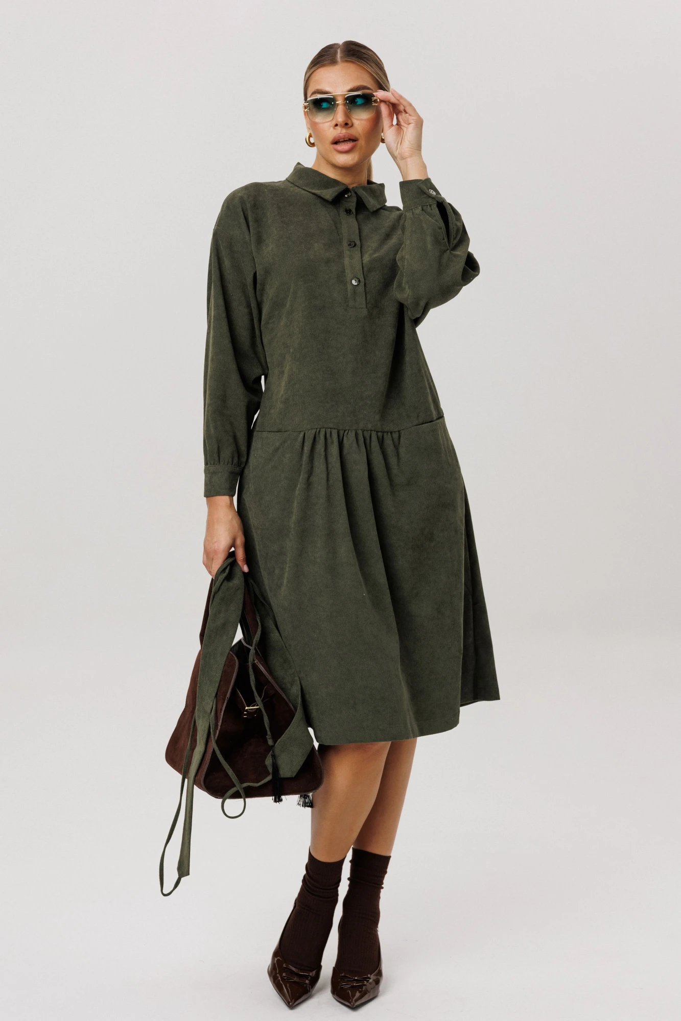 Длинный рукав с манжетой, спущенное плечо и волан со сборкой придают платью легкость и воздушность. Притачная планка на поясе выгодно подчеркивает талию, а пояс с кисточками привлекает внимание. Не оставит без внимания отложной воротник на стойке и застежка на пуговицы, подчеркивающие линии декольте.