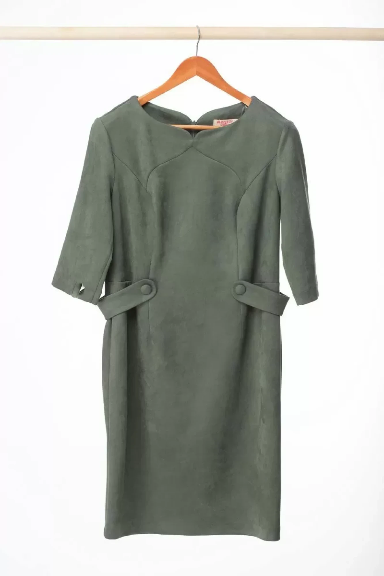 Линии рельефа переходят в выточку на талии. Линия талии подчеркнута патами с яркими пуговицами. Силуэт: Прилегающий