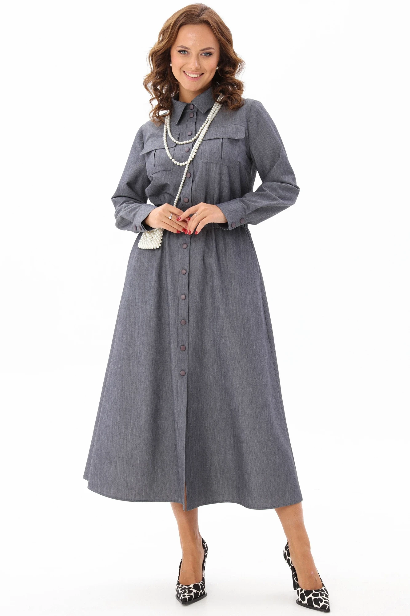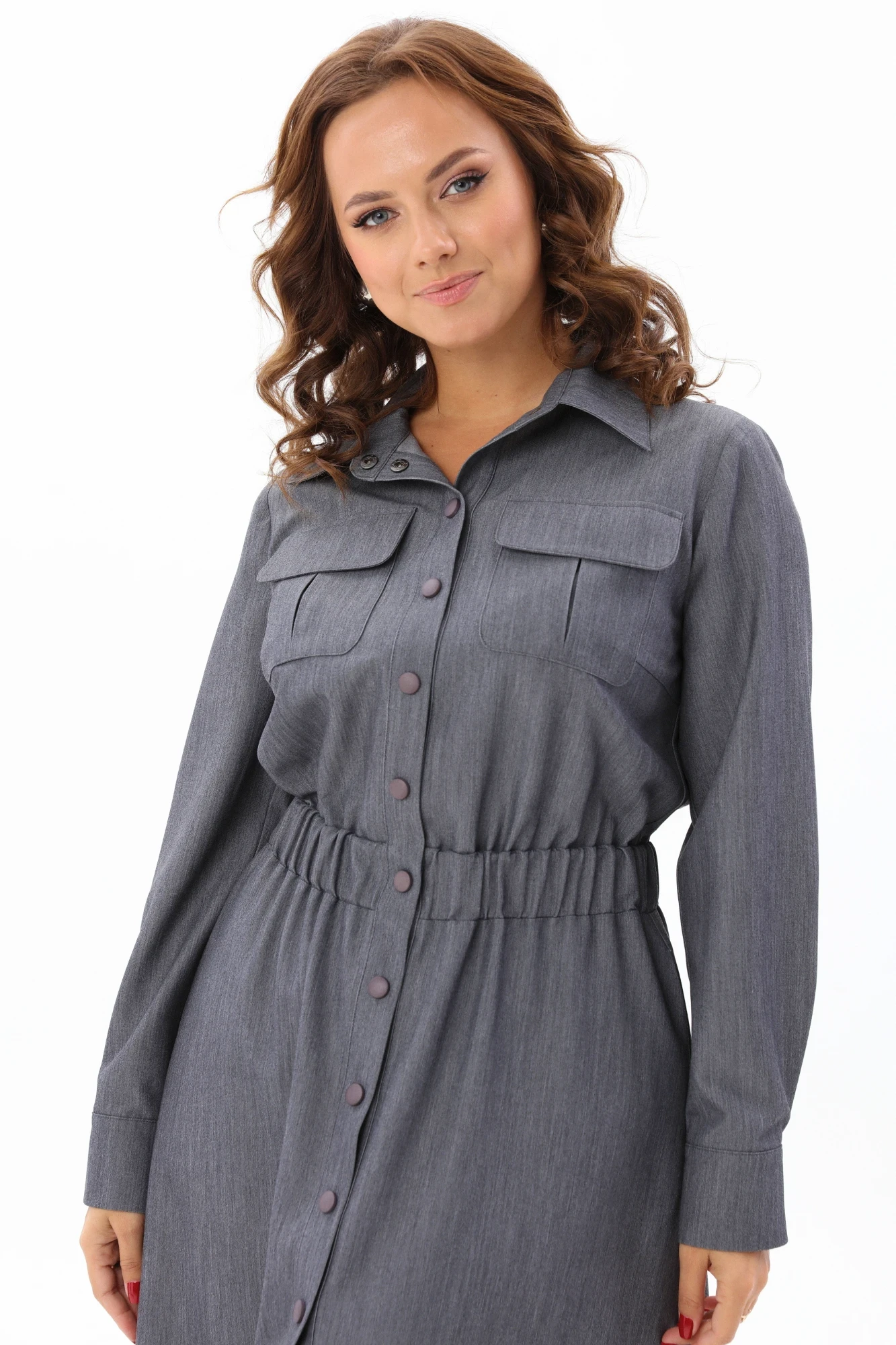 46, 48 , 50 , 52 , 54Платье полуприлегающего силуэта, расклешенное книзу. Воротник отложной, на притачной стойке. Платье отрезное по линии талии, на широкой резинке. Платье с центральной застежкой на кнопки на притачных планках. Полочка с нагрудными вытачками и накладными карманами со складкой и клапаном. В боковых швах юбки функциональные карманы. Рукав втачной длинный, понизу - широкая притачная манжета с застежкой на кнопки."