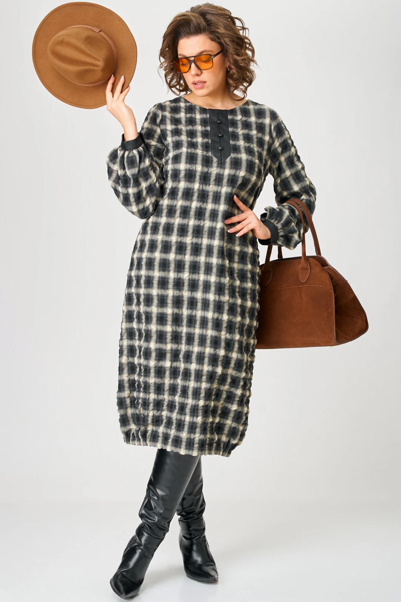 50,52,54, 56 ,58,60Платье свободного силуэта из жатой плательной ткани в клетку. Горловина округлой формы. Перед платья с нагрудными вытачками и декоративной планкой из эко кожи с пуговицами. Спинка с застежкой на молнию в среднем шве. В боковых швах глубокие функциональные карманы. Рукав втачной длинный, по низу декоративная манжета из эко кожи с застежкой на петлю и пуговицу. По низу платья по бокам вставлены резинки."