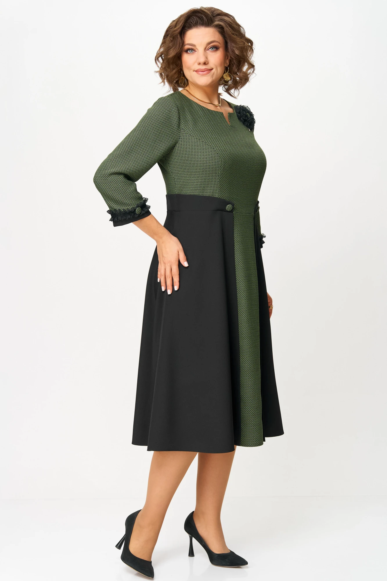 Платье полуприлегающего силуэта, отрезное по линии талии. Горловина с фигурным вырезом, обработана обтачкой. По переду лифа — рельефные швы. По спинке лифа талиевые вытачки и средний шов, в котором обработана потайная молния. Юбка платья ""клеш"", с вертикальной вставкой по переду и средним швом по спинке. Подрез по талии закрывается декоративным поясом с пуговицами. Добавят комфорта при носке функциональные карманы в боковых швах. Рукав втачной прямой, длиной ¾, по низу — манжет, декорированный тесьмой и пуговицой. В комплекте к платью прилагается съемное украшение из тесьмы.
