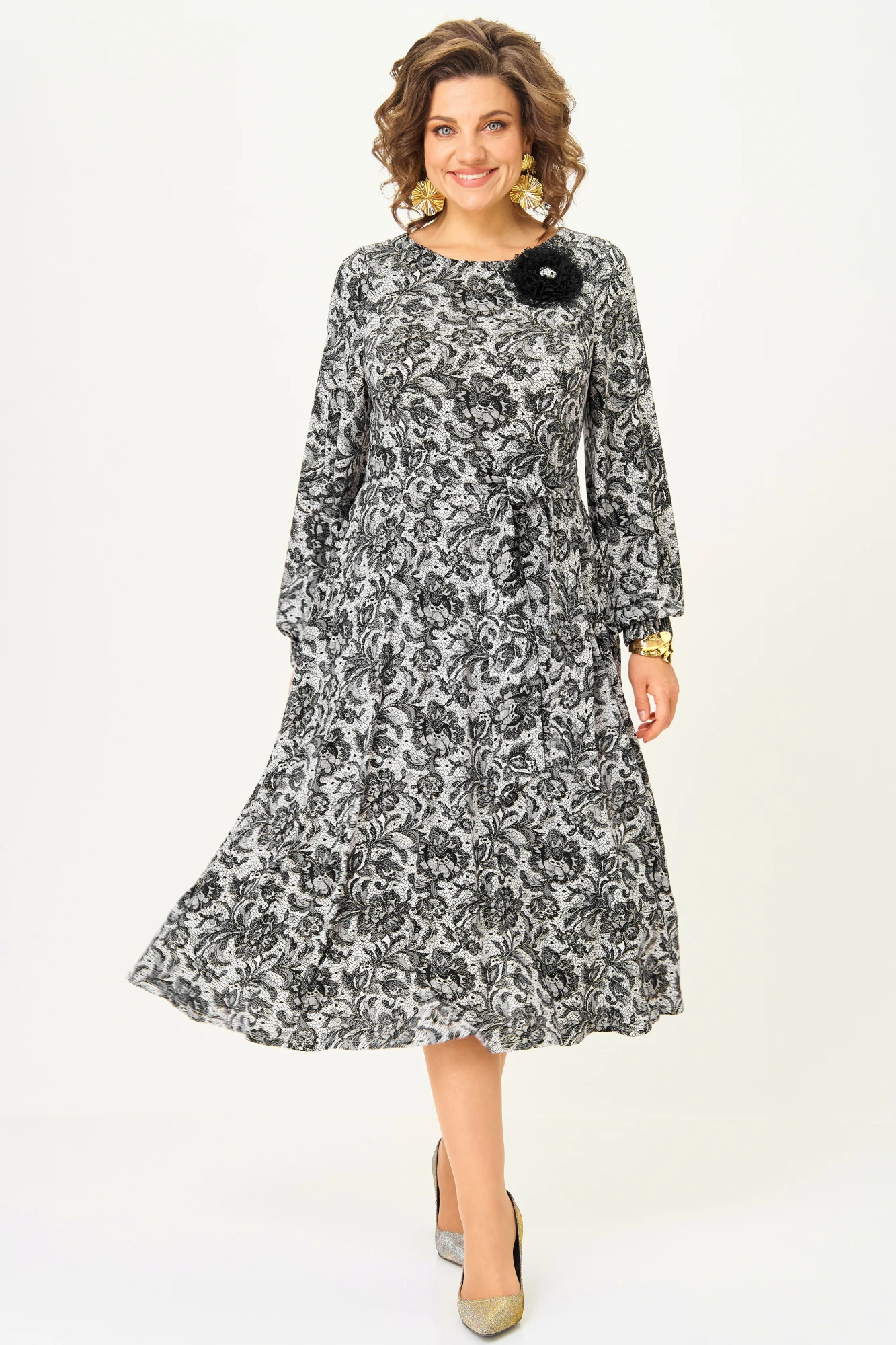 Платье полуприлегающего силуэта, длиной макси, отрезное по линии талии. Горловина округлой формы, обработана обтачкой. Перед лифа с рельефными швами, по спинке - талиевые вытачки. Застежка на молнию в боковом шве. Юбка платья - "полусолнце", расклешенная книзу, с функциональными карманами в боковых швах. Рукав втачной прямой, длинный, по низу — манжет на резинке. В комплекте к платью прилагаются съемное украшение-брошь и пояс, который поможет создать акцент на талии.