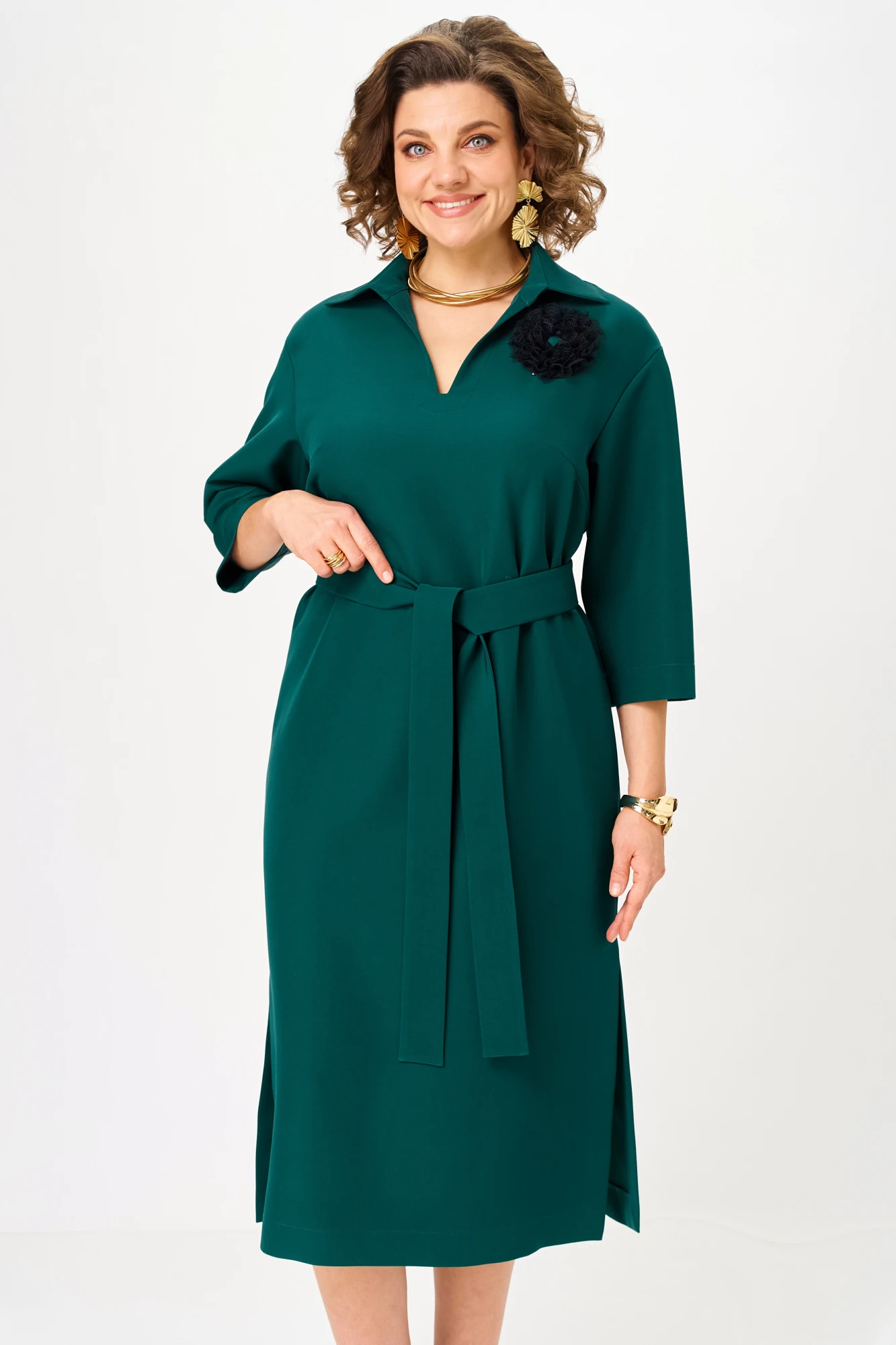 Платье прямого силуэта длиной миди. Горловина V-образной формы с отложным воротником на отрезной стойке. По переду платья нагрудные вытачки. Спинка с кокеткой. В боковых швах обработаны разрезы. Рукав втачной прямой длиной ¾ со спущенной линией плеча. Поясом из основной ткани можно подчеркнуть линию талии. В комплекте к платью прилагается съемное украшение-брошь из тесьмы.