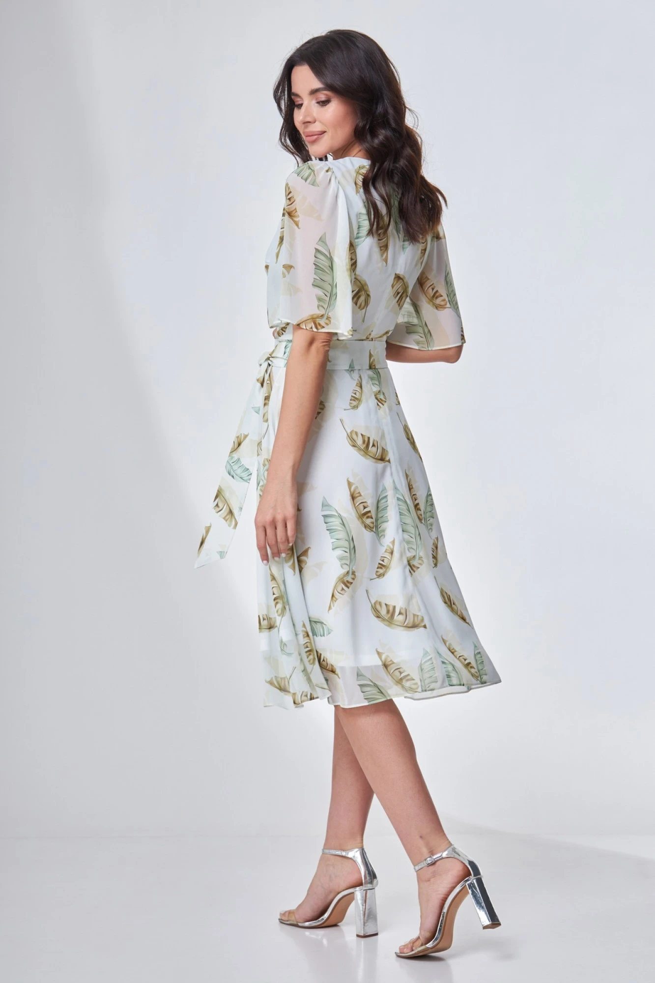 42, 44 ,46,48, 50 , 52Платье полуприлегающего силуэта, расклешенное книзу, на трикотажной подкладке. Горловина V-образной формы. Платье отрезное по линии талии. По переду нагрудные и талиевые вытачки. Спинка с рельефами и потайной застежкой молнией в среднем шве. Рукав втачной расклешенный короткий, со сборкой по окату. В комплекте съемный пояс из основной ткани.