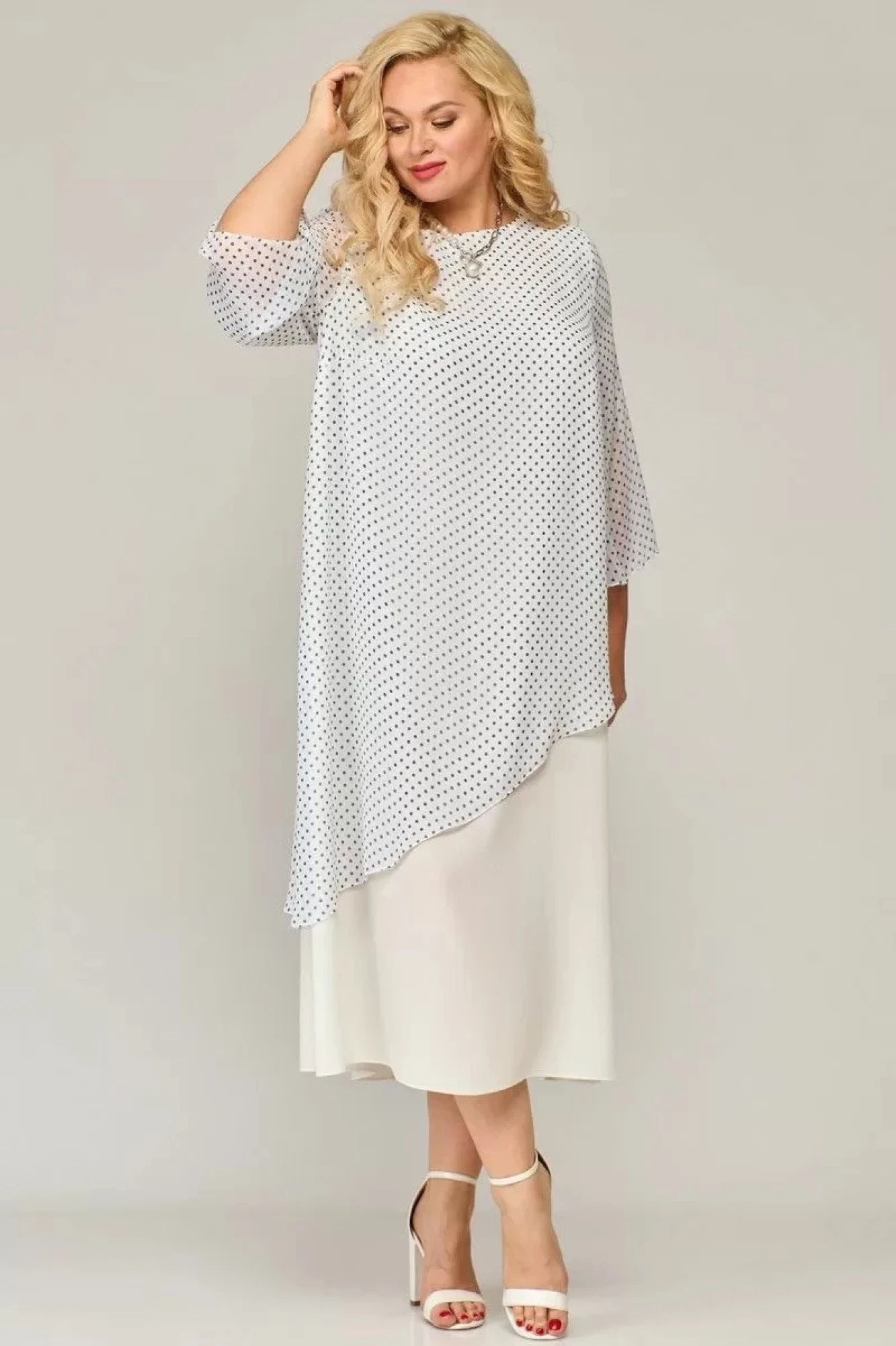 Двухслойное платье А-силуэта, длиной до середины икры. Горловина округлой формы, по спинке разрез и застежка на навесную петлю и пуговицу. Верхний слой по переду с нагрудными вытачками и ассиметричной линией низа. Нижний слой из однотонной ткани, по спинке со средним швом. Рукав втачной широкий, длиной ¾."