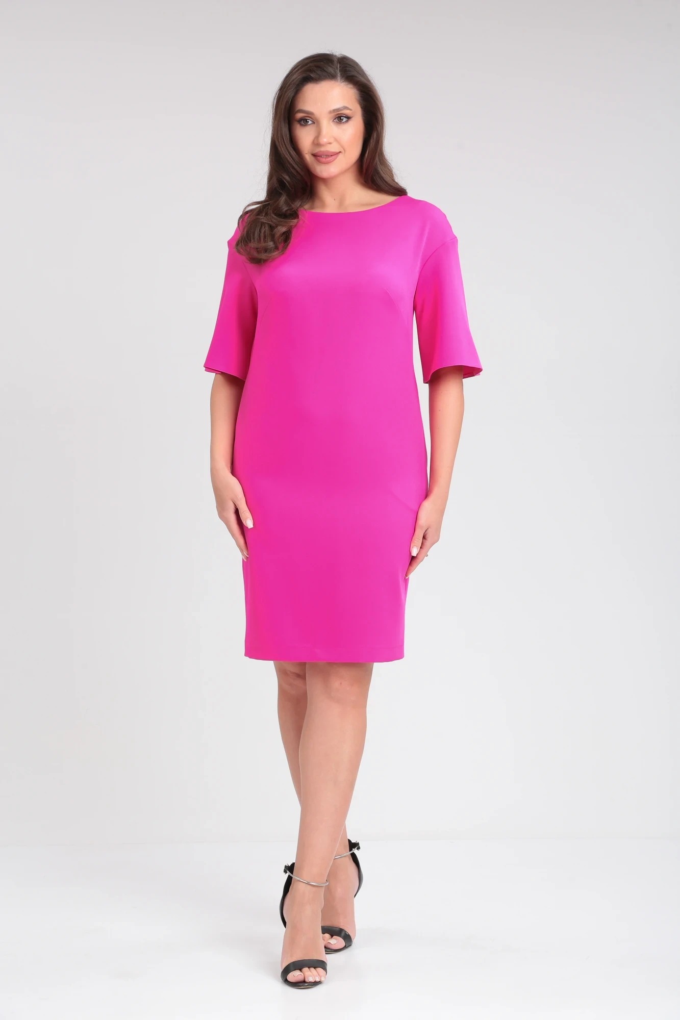 Платье прямого кроя, с выточками по груди, чуть заужено к низу. Длина до середины колена