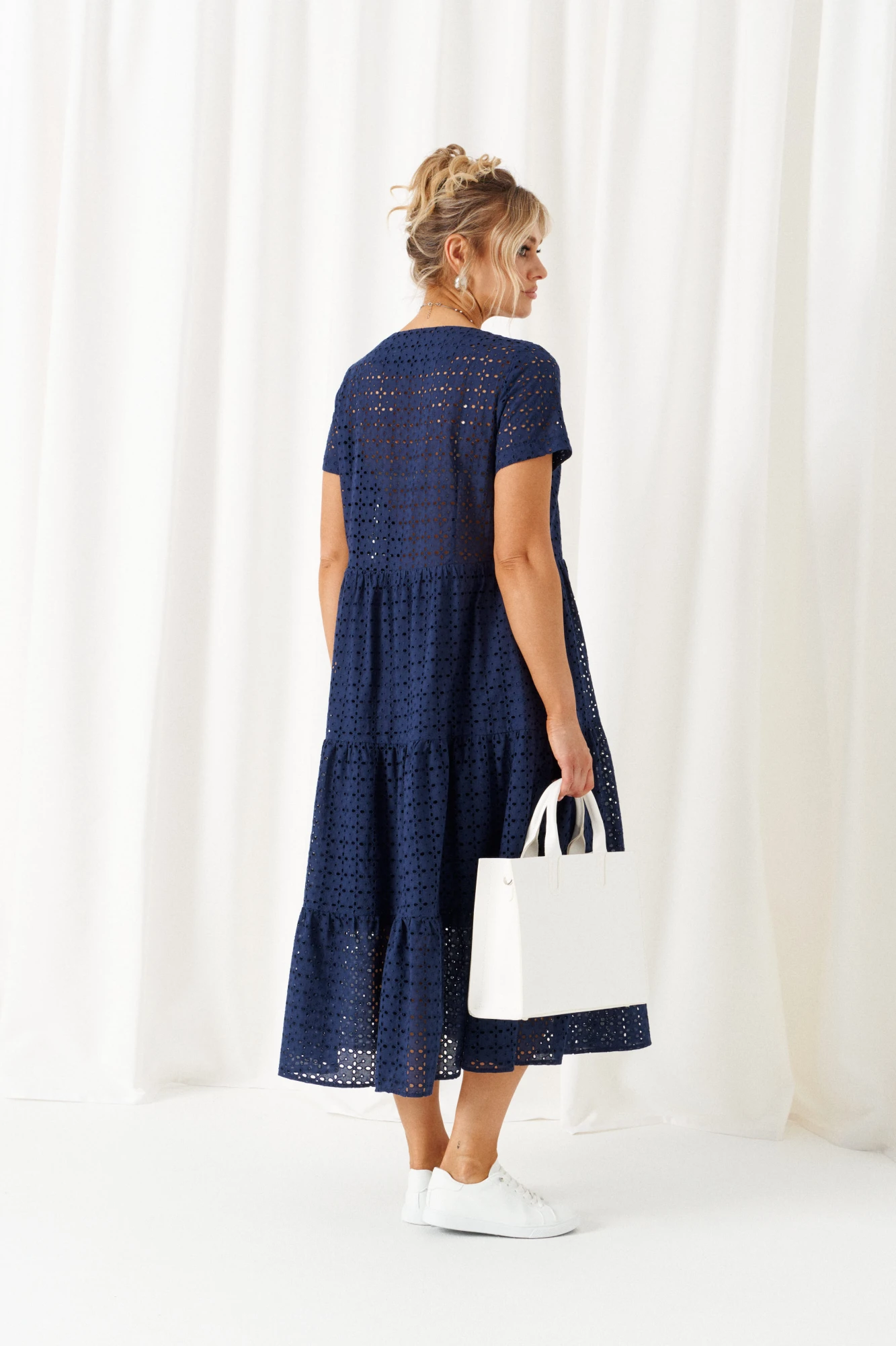 Низ платья объемный, широкий состоит из трех воланов одинаковой ширины.