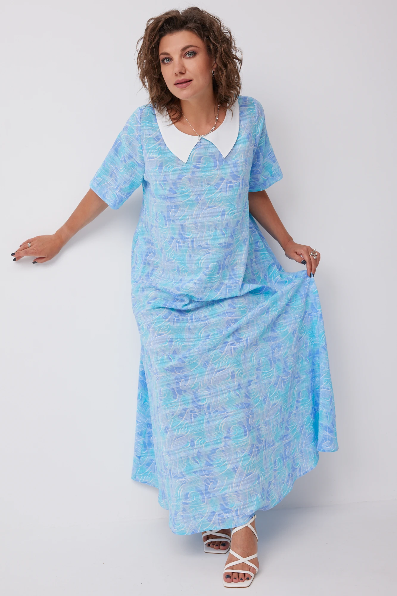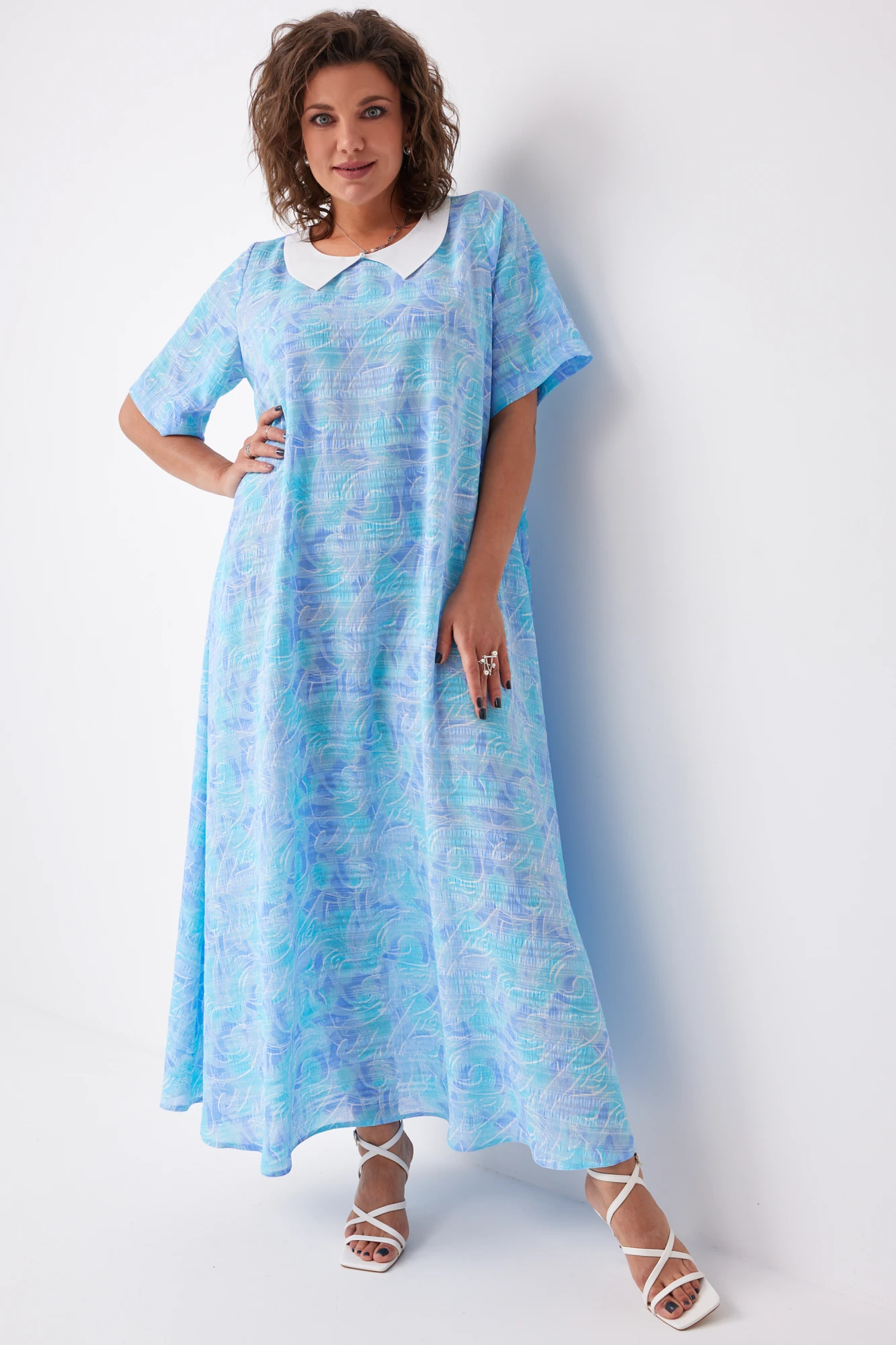 Короткие рукава добавляют легкость и воздушность, а белоснежный воротник добавляет свежесть образу. Оно идеально подойдет для летних прогулок, вечерних мероприятий или просто для создания особенного настроения в обычный день. В нем вы будете чувствовать себя королевой, излучаю-щей красоту и уверенность.