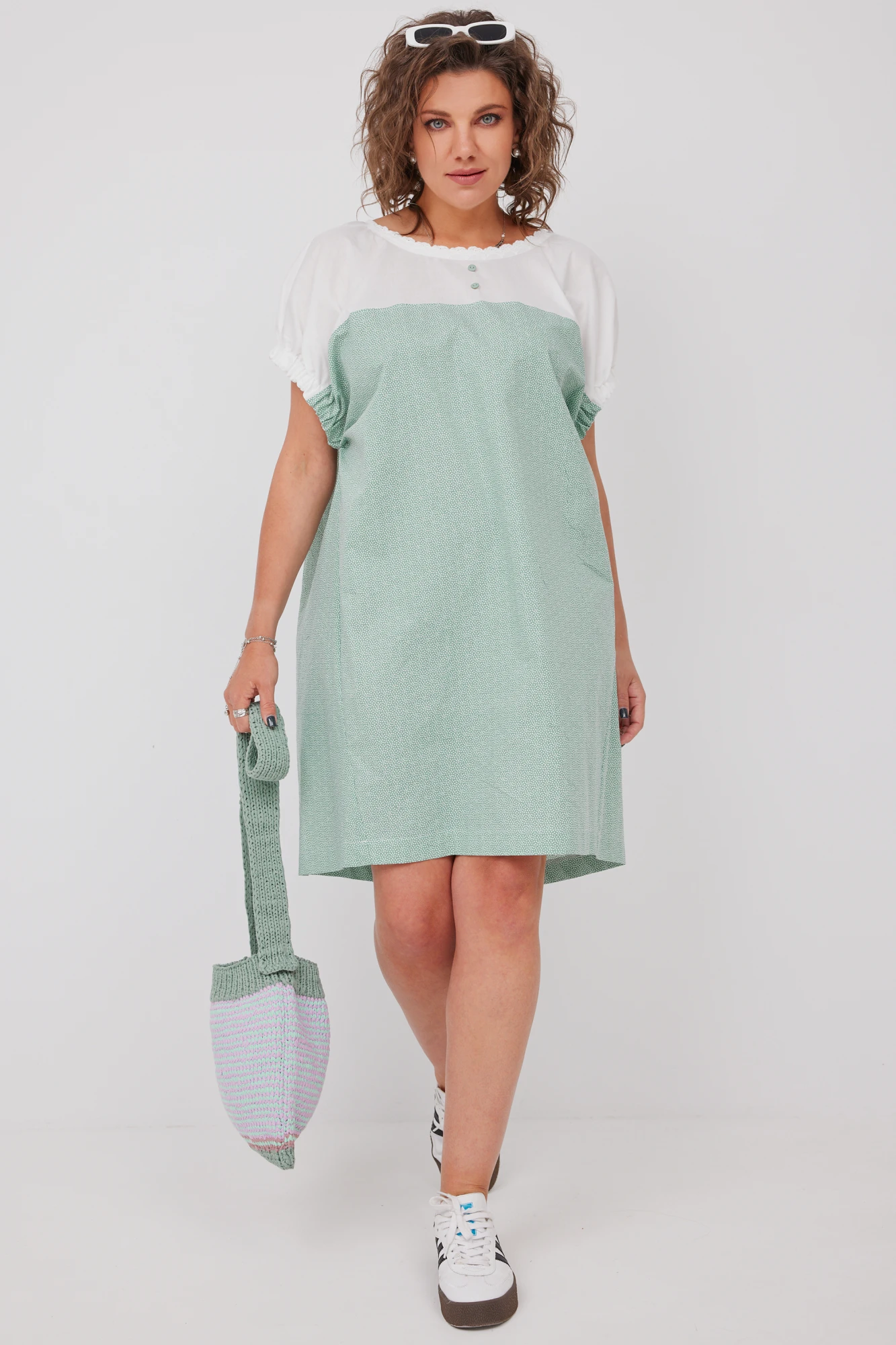 Комбинирование молочного и мятного оттенков прекрасно освежает образ. Горловина имеет округлый вырез, который обработан декоративной тесьмой ришелье и декорирован контрастными пуговицами.