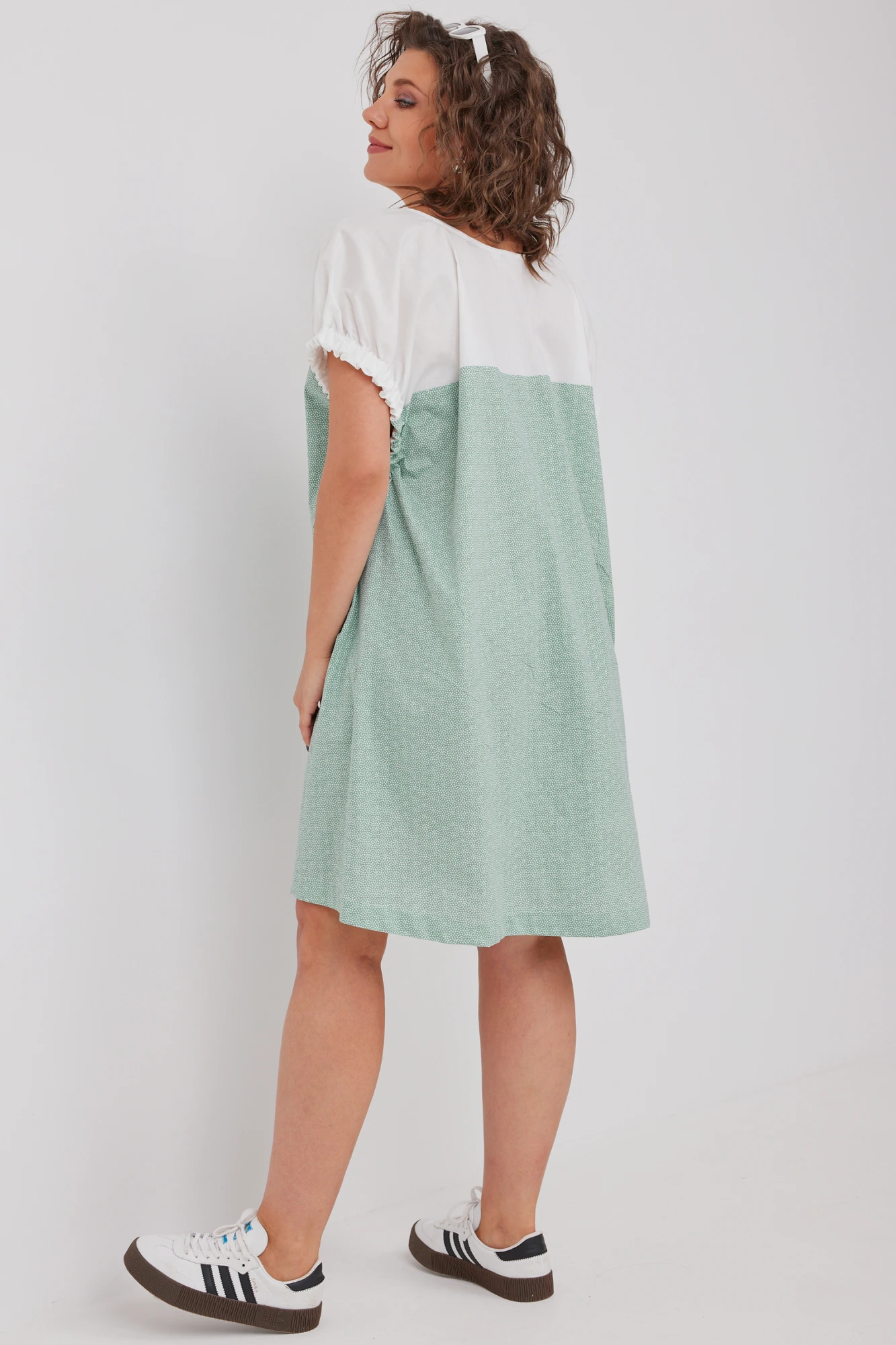 Комбинирование молочного и мятного оттенков прекрасно освежает образ. Горловина имеет округлый вырез, который обработан декоративной тесьмой ришелье и декорирован контрастными пуговицами.
