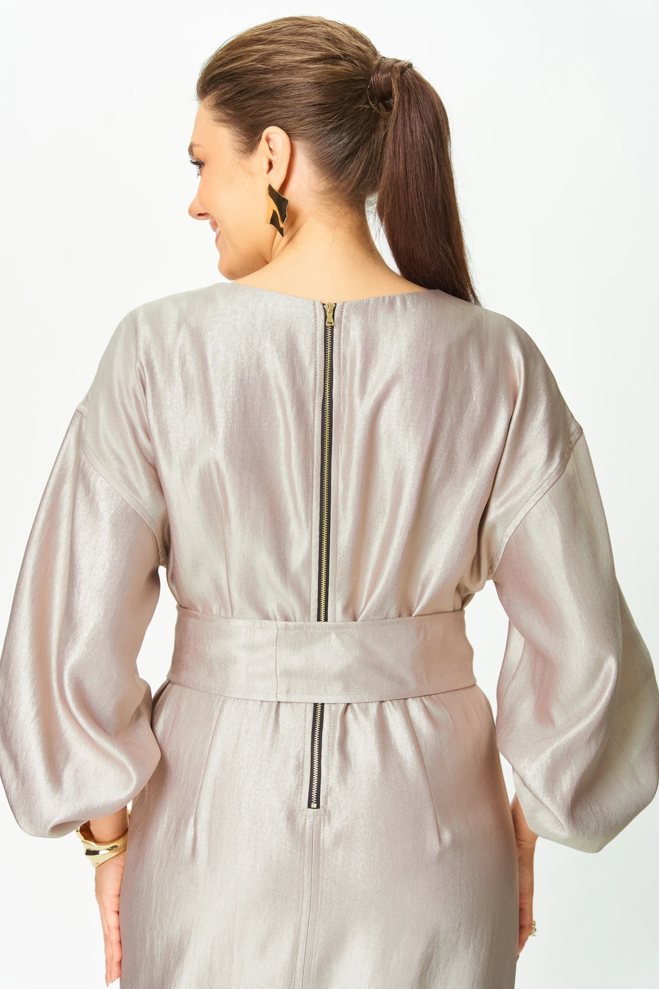 Платье прямого силуэта, с отрезными бочками и разрезом по низу платья. Застежка на декоративную молнию в центральном шве спинки. Горловина круглая. Рукава со спущенной проймой. Рукав широкий, с асимметричным низом, собранным на резинку.