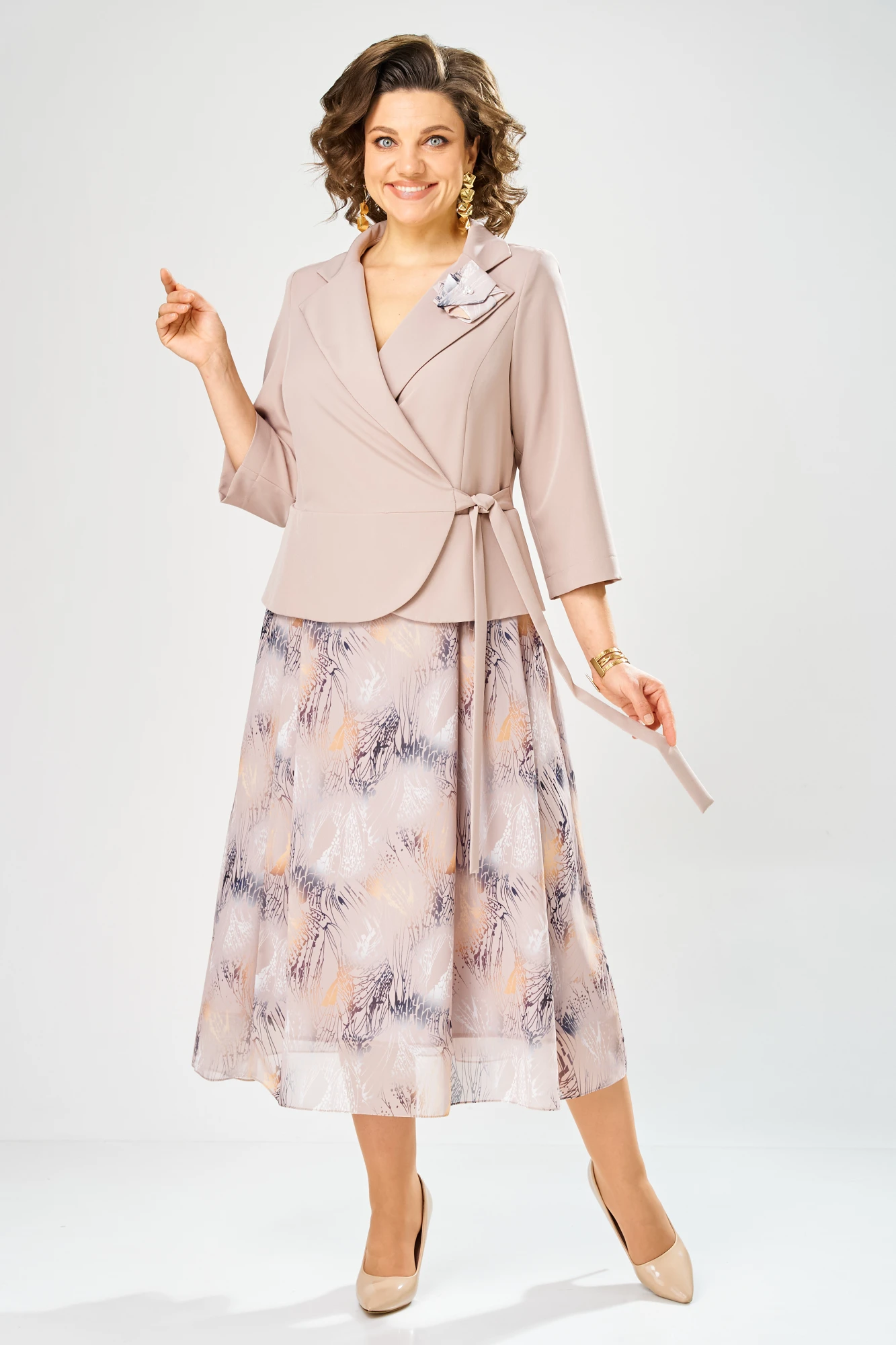 Лиф из плательной ткани, юбка из шифона. Платье с запахом, горловина с воротником пиджачного типа с отложными лацканами. Рукава втачные, длина 3/4.