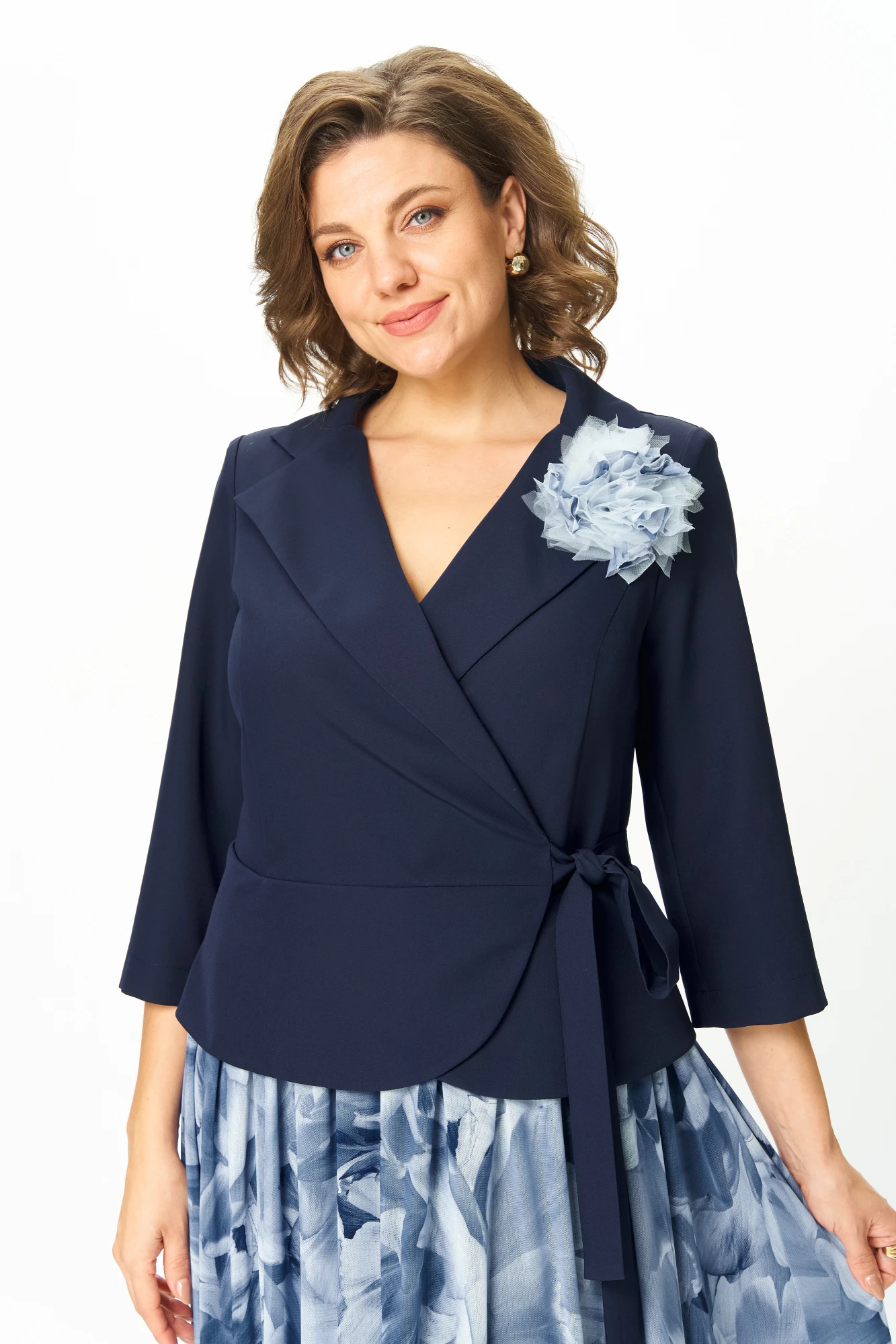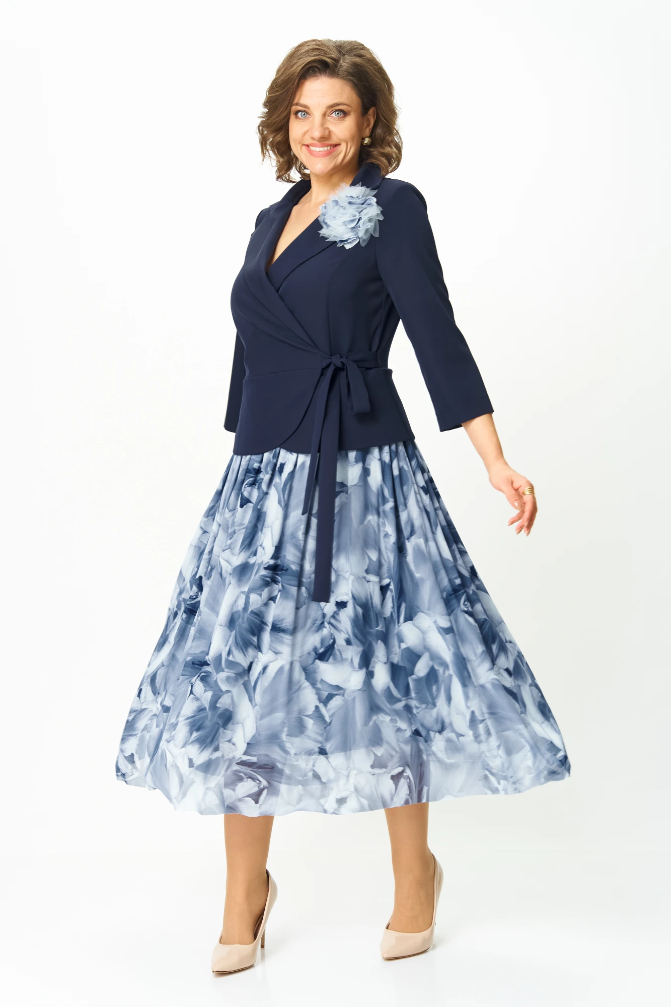 Платье полуприлегающего силуэта, верх жакетного типа с запахом. Юбка расширенная со сборкой по талии, на подкладке.