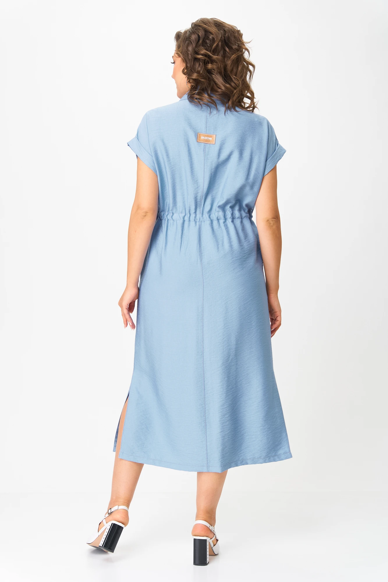Платье полуприлегающего силуэта. Горловина с рубашечным воротником, застежка на декоративную молнию до уровня груди. По переду, на лифе и юбке накладные карманы. По талии надстрочная кулиса со шнуром.