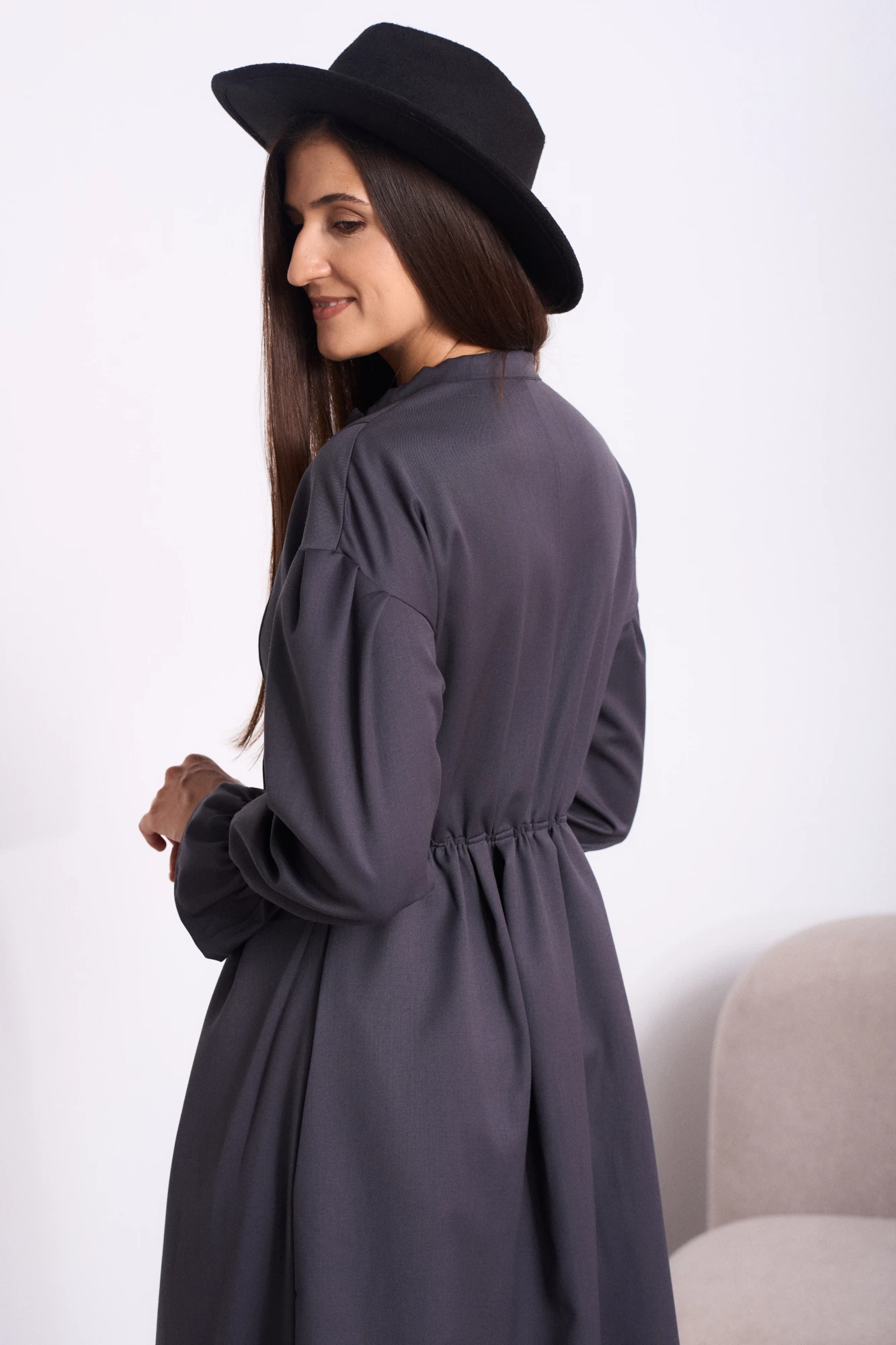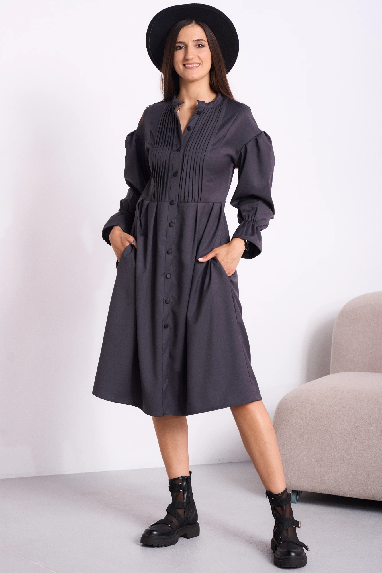 Натуральный состав ткани позволяет коже дышать, обеспечивая максимальный комфорт на протяжении всего дня. Платье прямого силуэта, слегка расширяющееся к низу, свободного кроя, с округлой горловиной обработанной воротником стойкой. Застежка центральная на петли и пуговицы позволяет регулировать глубину выреза. Рукав платья со спущенным плечом и манжетой на резинке создают непринужденный и элегантный силуэт. Центральная часть полочки обработана односторонними складками, линия талии подчеркнута легкой сборкой (защипы). Особая деталь платья Celentano – присобранный на эластичную тесьму лиф по спинке на уровне талии. Это гениальное решение обеспечивает идеальную посадку на любой фигуре в размерном ряду от 42 до 52. Платье прекрасно приталено, подчеркивая женственные формы, и при этом не сковывает движений. В платье есть внутренние карманы в боковых швах, что придает удобства платью.Ткань не тянется. Длина платья 106 см, длина рукава 69см с учетом приспущенного плеча.