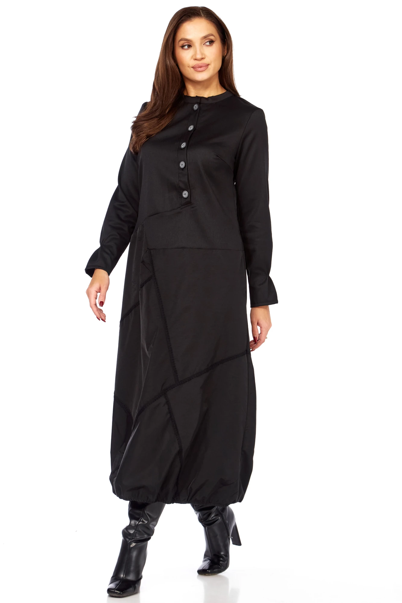 • Силуэт: Прямой, слегка расширяющийся к низу. Модель предполагает свободную посадку по фигуре. Нижняя часть платья имеет сложный крой, создающий эффект "баллона" или асимметричного многослойного объема.