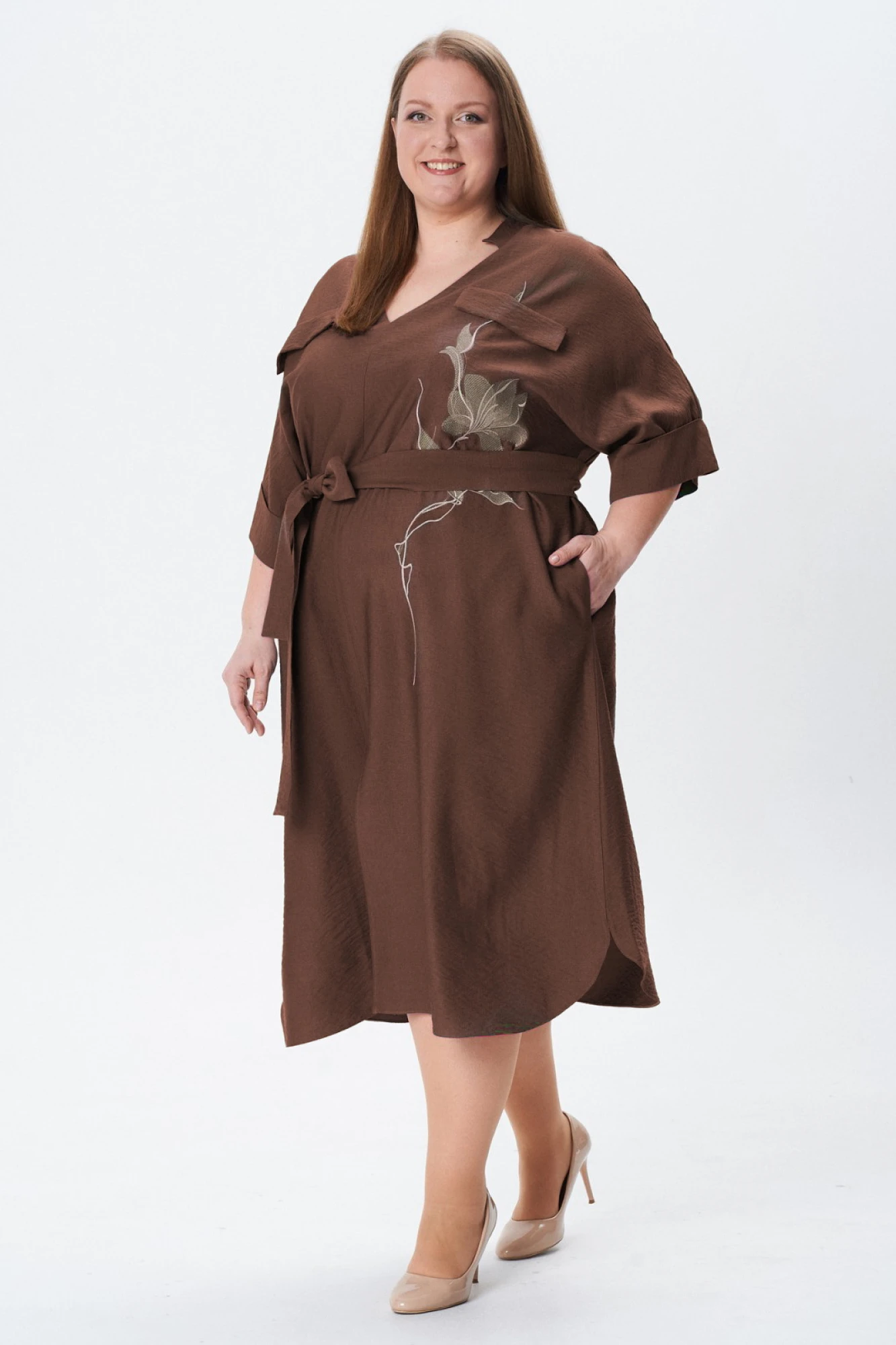 Особое внимание привлекает декоративная вышивка и клапаны на передней части платья — они создают уникальный акцент, подчеркивающий вашу индивидуальность. Съемный пояс позволяет легко регулировать силуэт, акцентируя талию и создавая дополнительные варианты стиля. Это платье отлично подойдет как для повседневных выходов, так и для особых случаев, добавив вашему гардеробу особое очарование и шик.