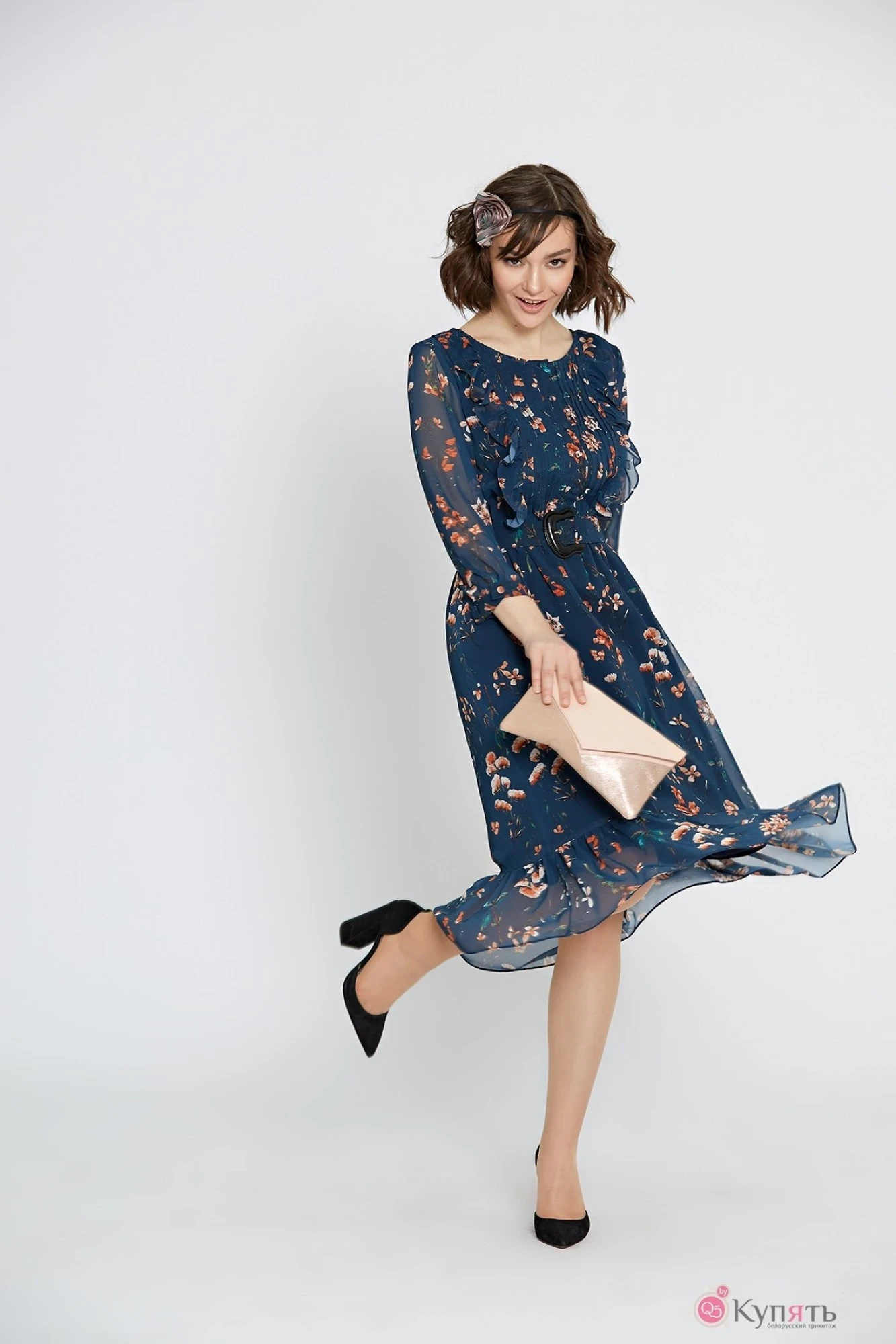 Платье женское , нарядное , отрезное по линии талии на резинке , расклешенное книзу , из текстильной ткани с цветочным принтом длиной ниже линии колен . Верхняя часть переда платья с рельефами ,вертикальными складками выходящими из линии горловины до линии подреза талии , рюшами выходящими из рельефа , притачной планкой на застежке . Спинка разрезная . Рукав втачной , одношовный 3/4 по низу обработан манжетой с застежкой на пуговицу . Вырез головины обработан косой бейкой из основной ткани . По низу платья волан на сборке . Платье на подкладке . В комплекте пояс из основной ткани с застежкой на декоративной пряжке .