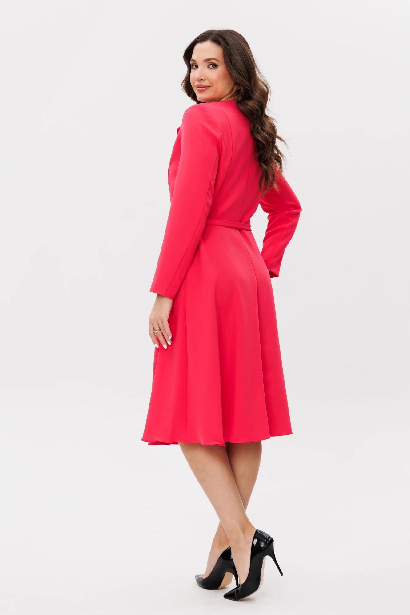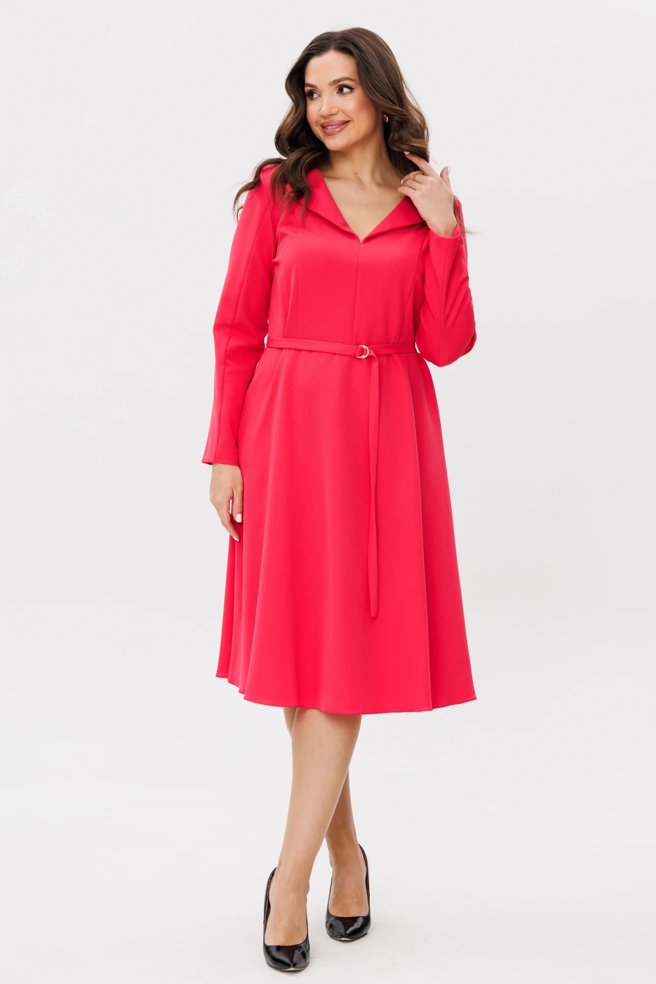 Нижняя часть платья - коническая. Модель дополнена съёмным поясом с пряжкой.