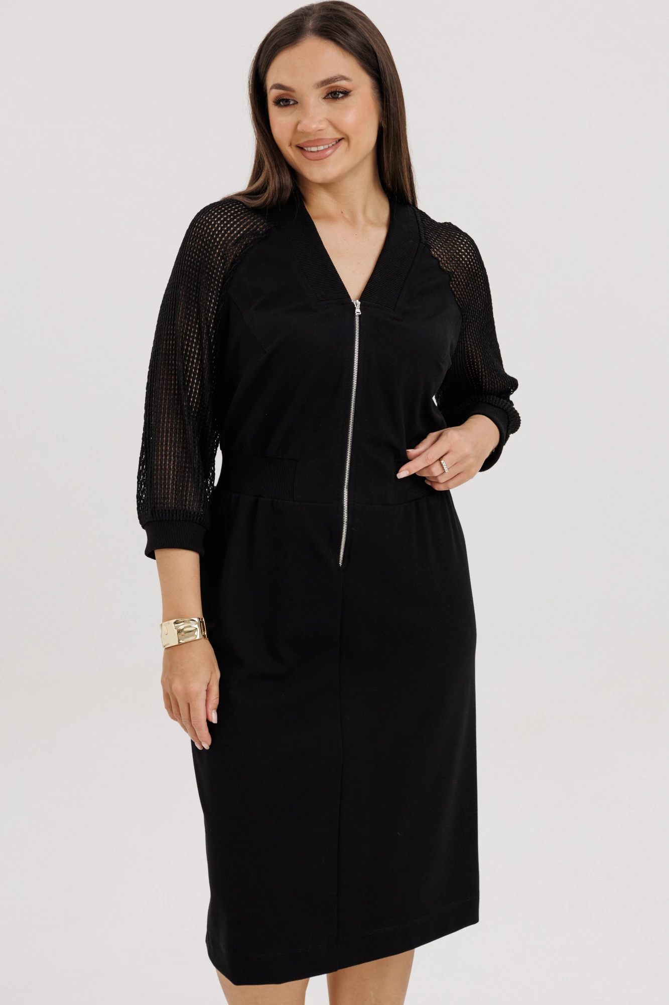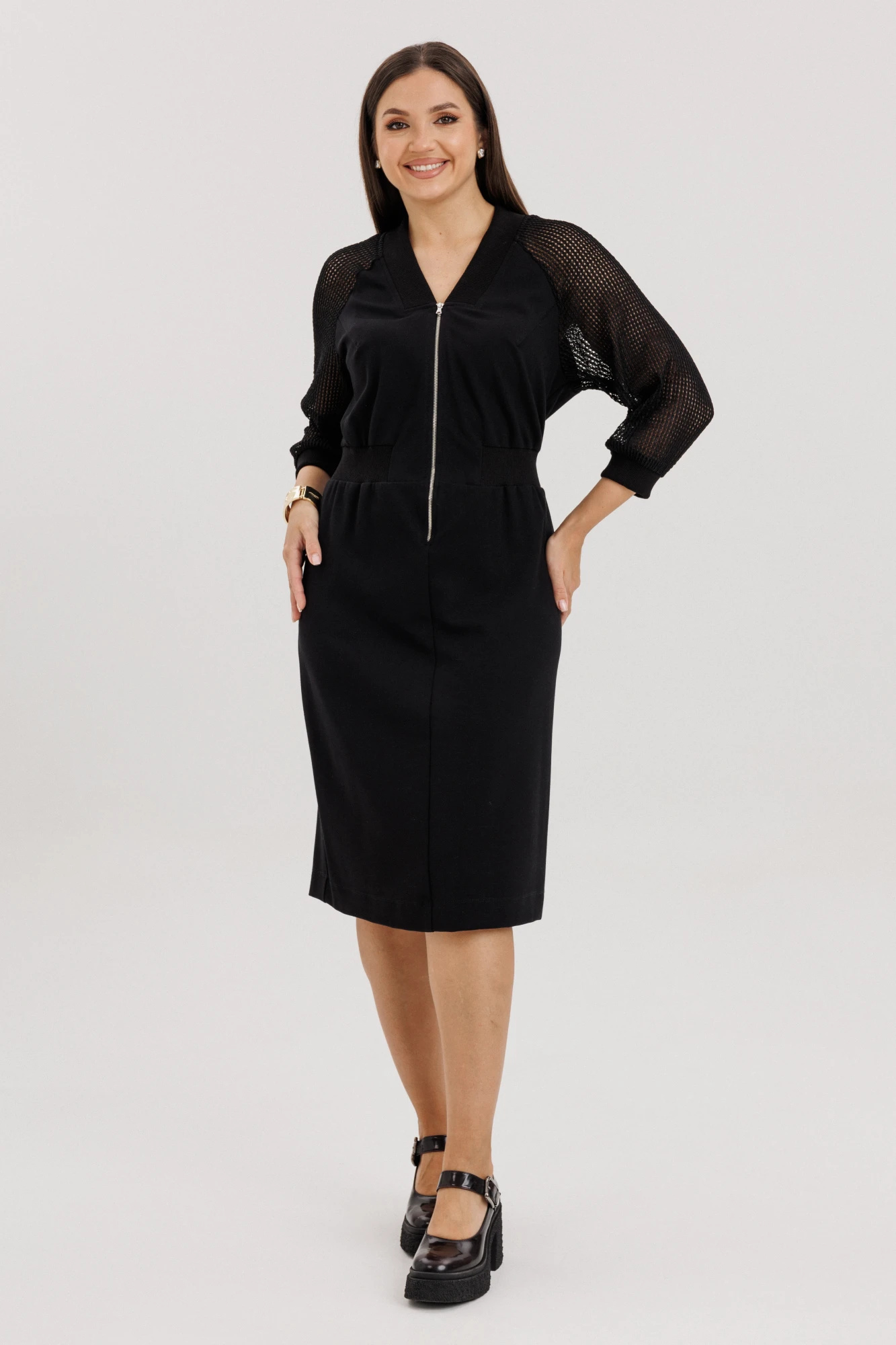 Полочка с нагрудными вытачками и центральным швом. Рукав из отделочной ткани. Линию талии подчёркивает трикотажное эластичное полотно в тон основной ткани, повышенной эластичности. Этим же отделочным полотном обработана горловина и манжета рукавов.