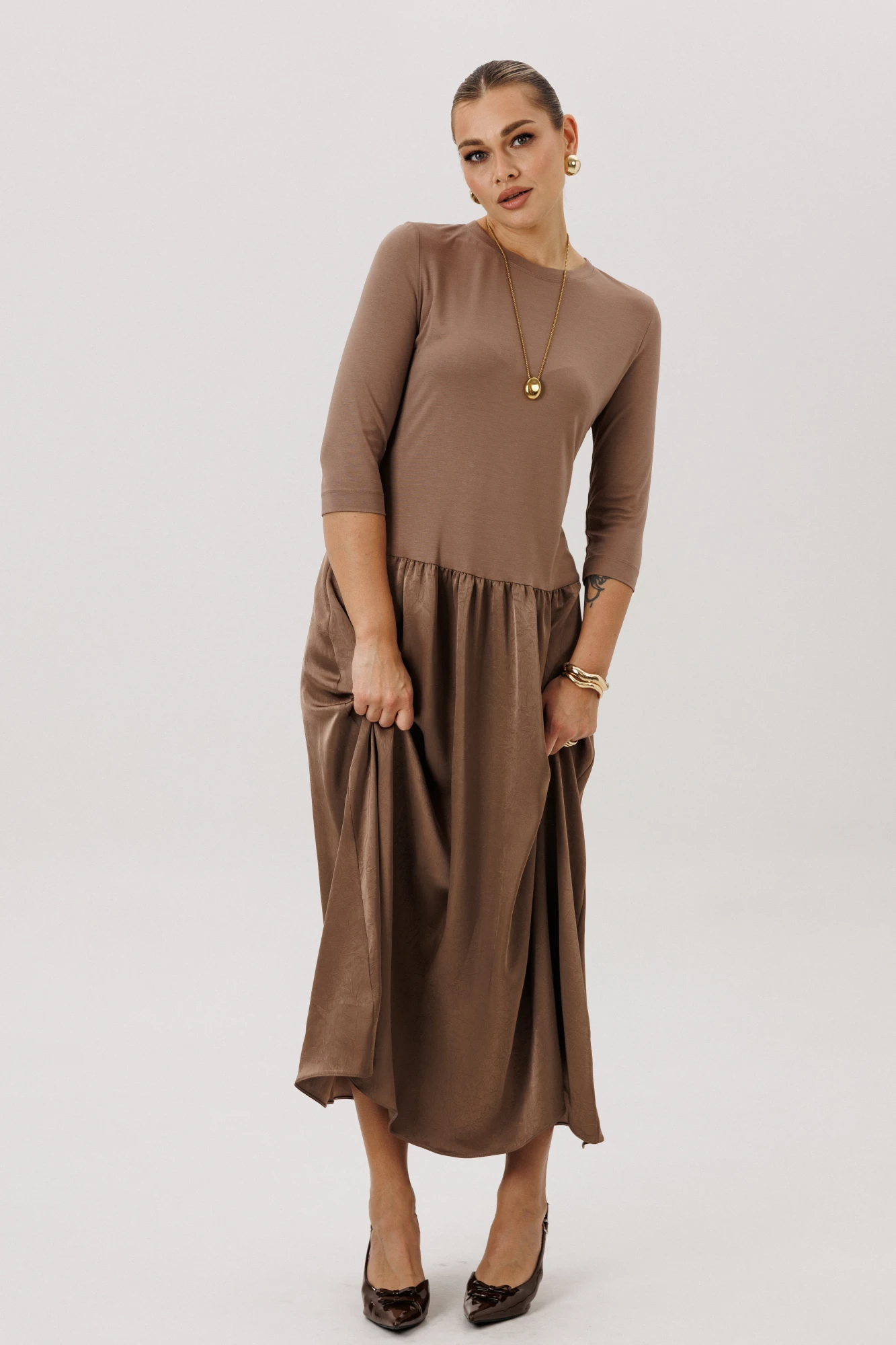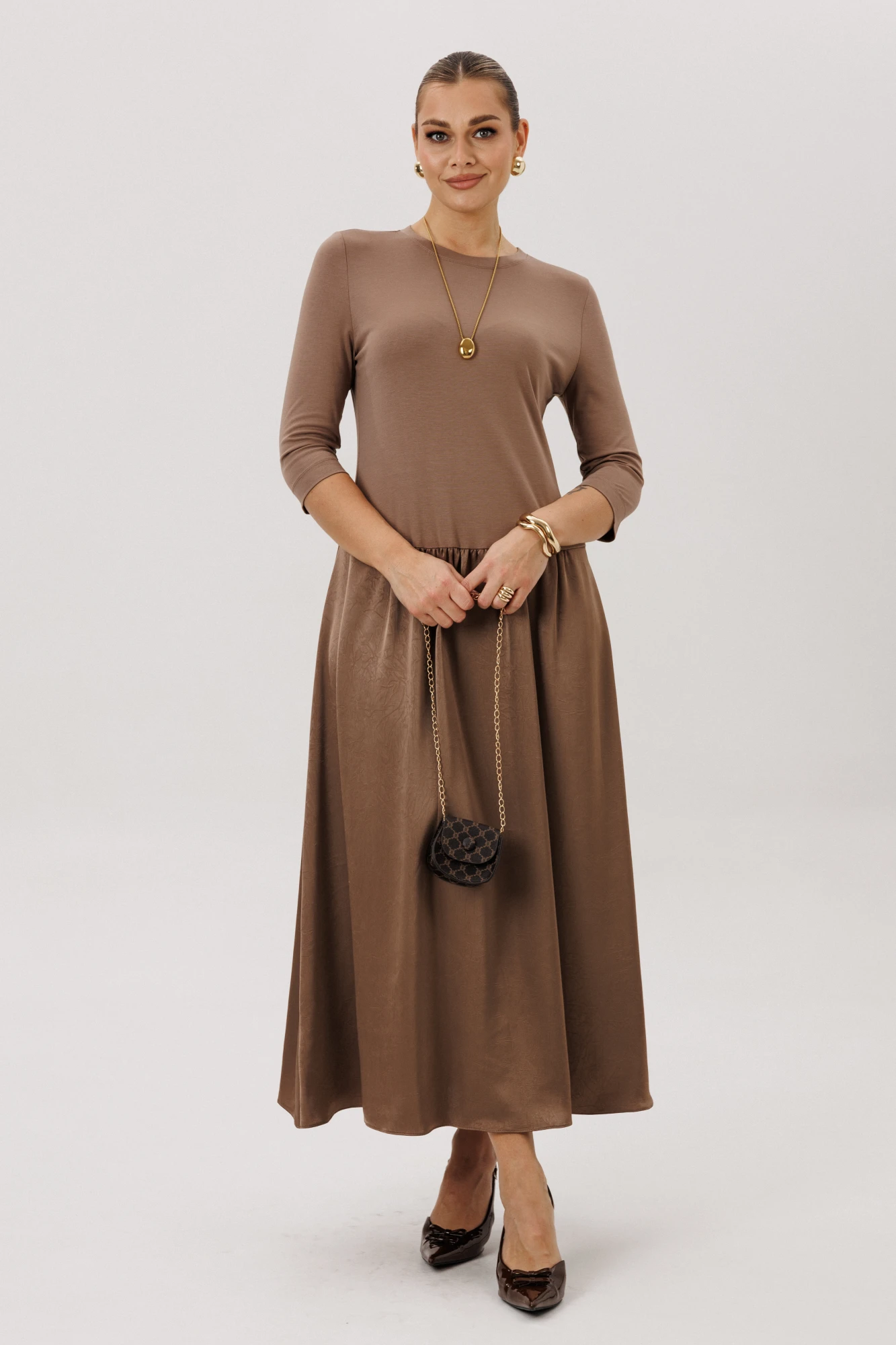 Свободный силуэт, втачной покрой, круглая горловина с эффектной каплей на спине. Верх платья - из мягкого трикотажа, низ - из невероятного вискозного крэшевого полотна.