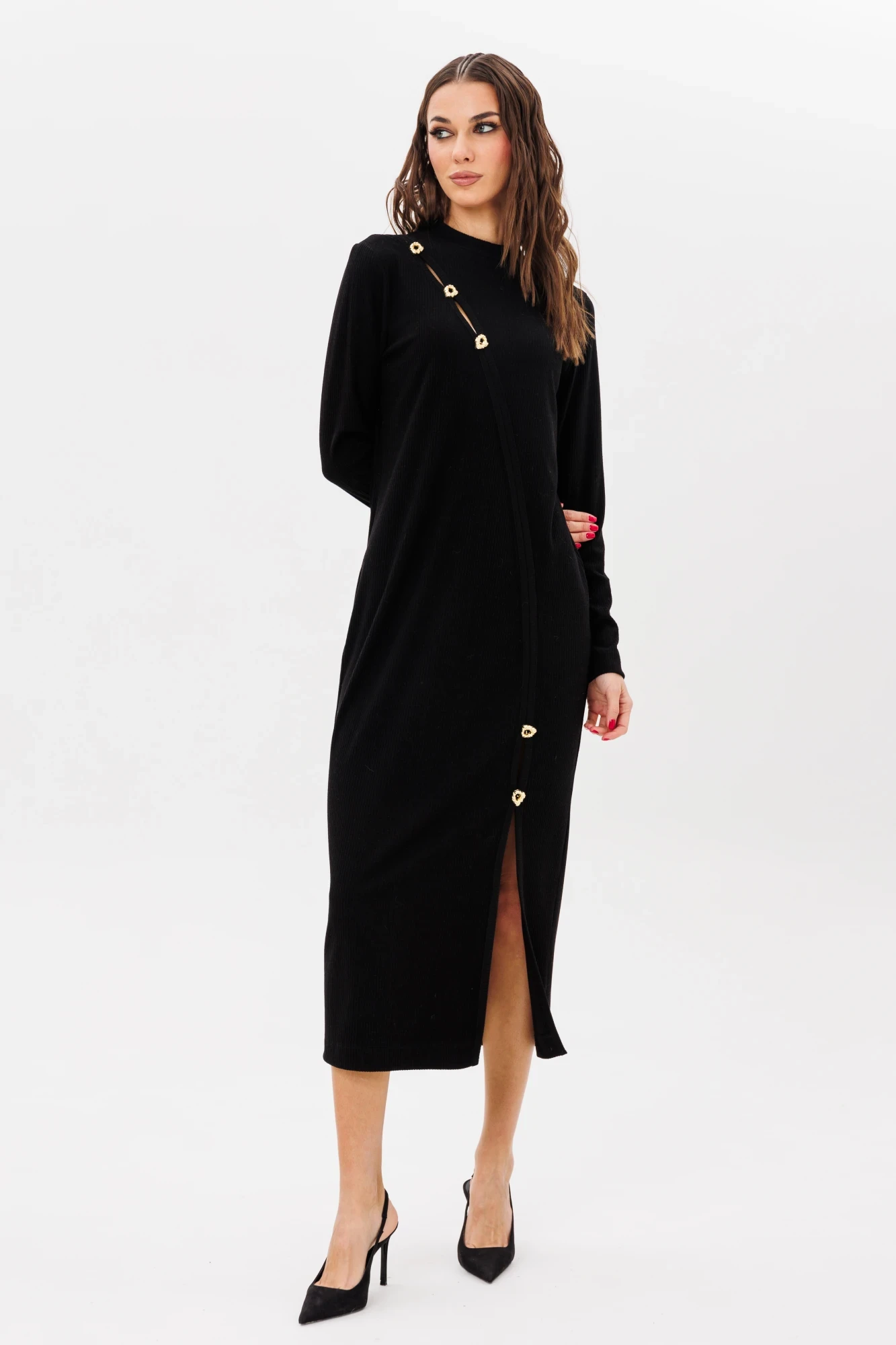 42, 44 , 46 ,48Полуприлегающий силуэт, втачной покрой, воротник стойка, фигурный ассиметричный рельеф по полочке переходящий в разрез по низу. Рельеф с частично открытыми каплями, подчеркнутый дизайнерскими пуговицами. Все это делает наше платье нарядным и одновременно повседневным!"