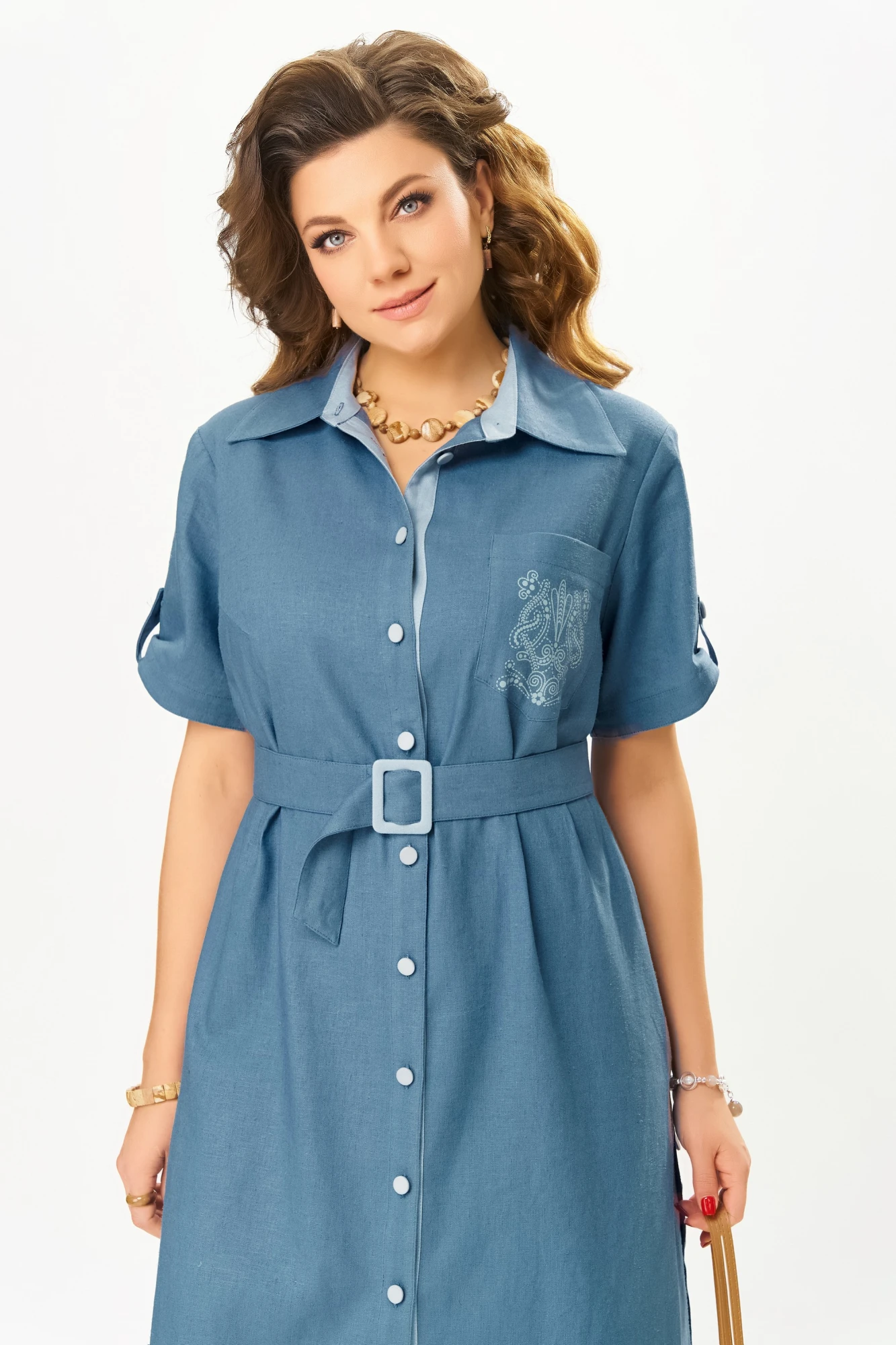 Детали делают это платье особенным: однобортная рубашечная застежка с отделочной внутренней планкой придает классический штрих, а воротник-стойка добавляет структуру и элегантность. Нагрудная выточка обеспечивает комфортную посадку, а накладной карман с декоративной печатью на левой полочке — стильный акцент.