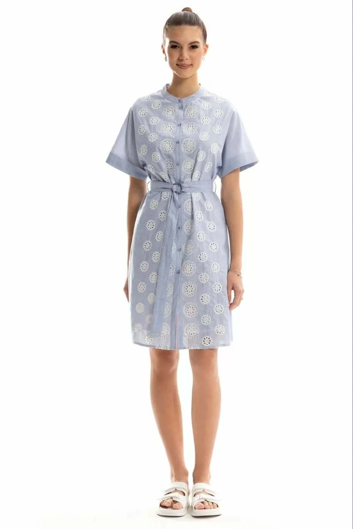 Цветовая гамма для верха, подкладки, фурнитуры, отделки: платье выполнено из ткани с купонной вышивкой в одной цветовой гамме.