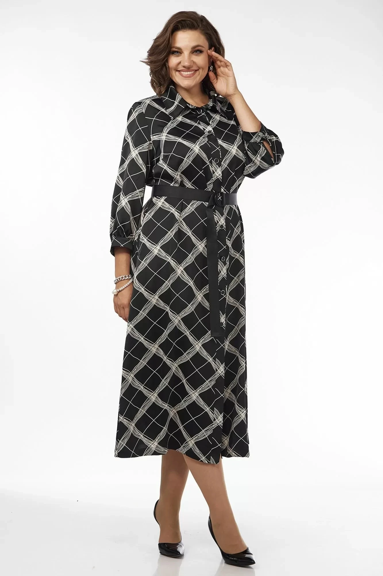 54, 56 , 58Длина платья по спинке – 123 см, рукава – 49 см.