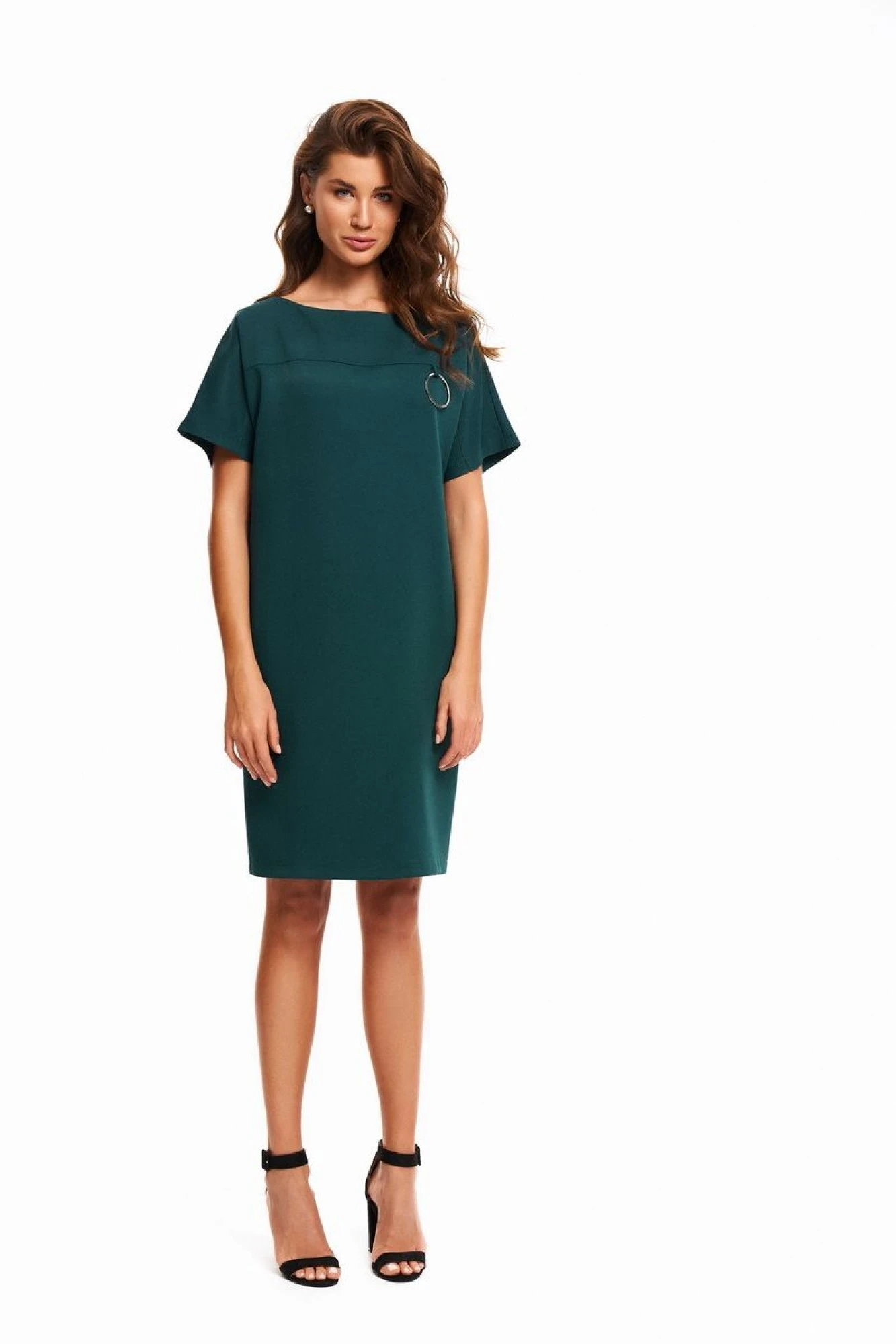 46,48,50,52,54,56,58,60На левой стороне переда декоративное металлическое кольцо. Спинка с фигурным вырезом, украшена металлическими кольцами.