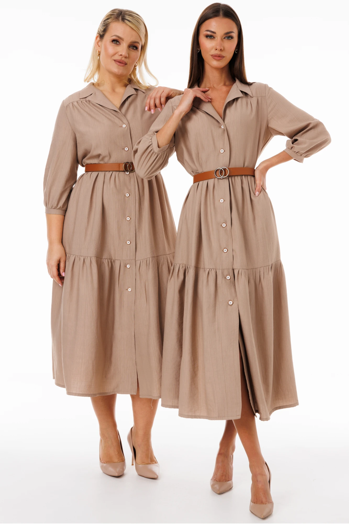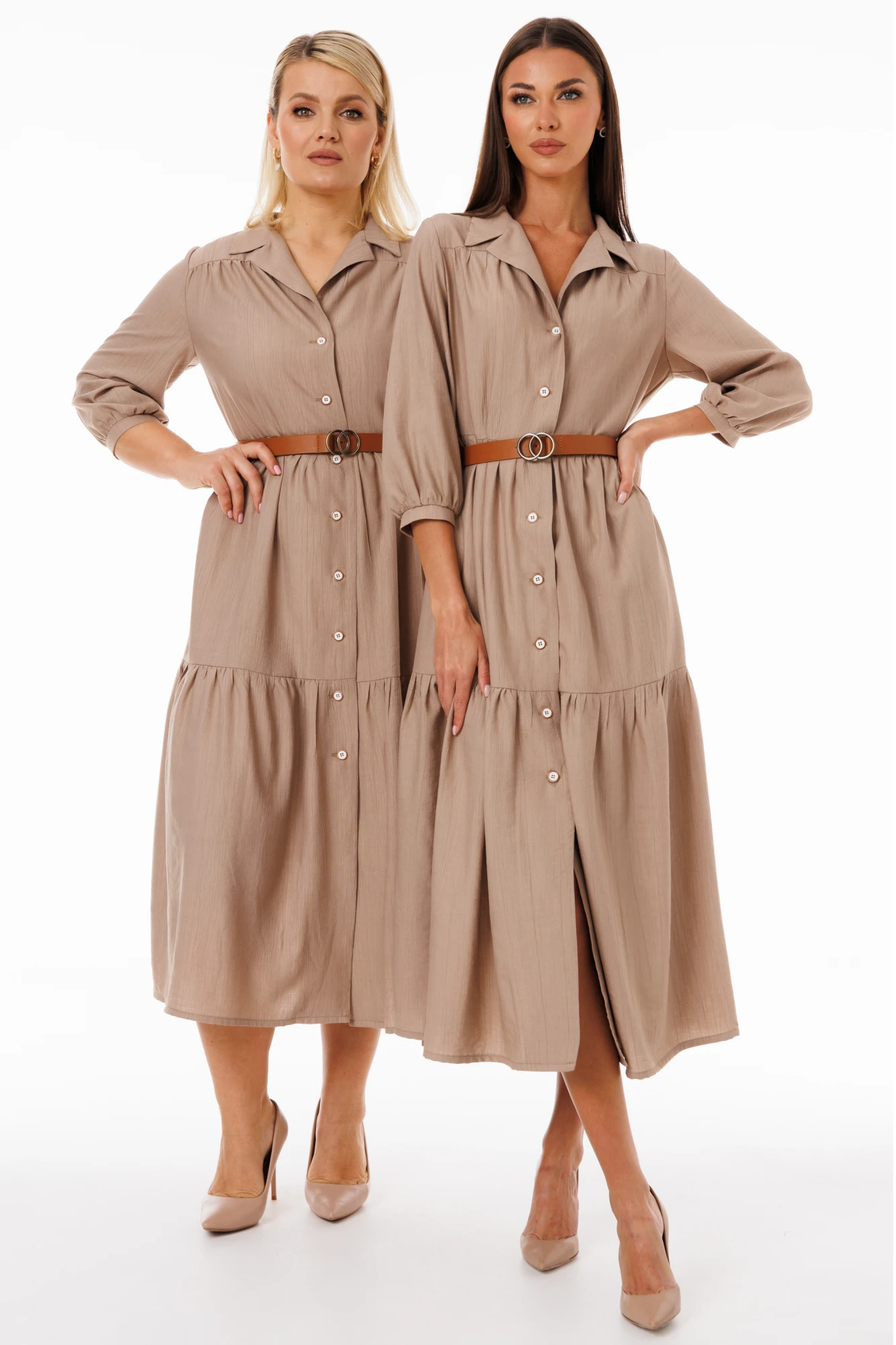 Пуговицы по переду не только выполняют практичную функцию, но и служат стильным акцентом, позволяя регулировать степень открытости платья. В комплекте идет пояс, с помощью которого можно подчеркнуть талию, создавая более структурированный образ.