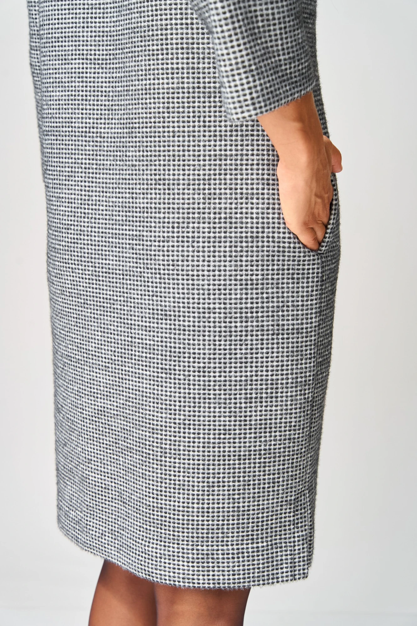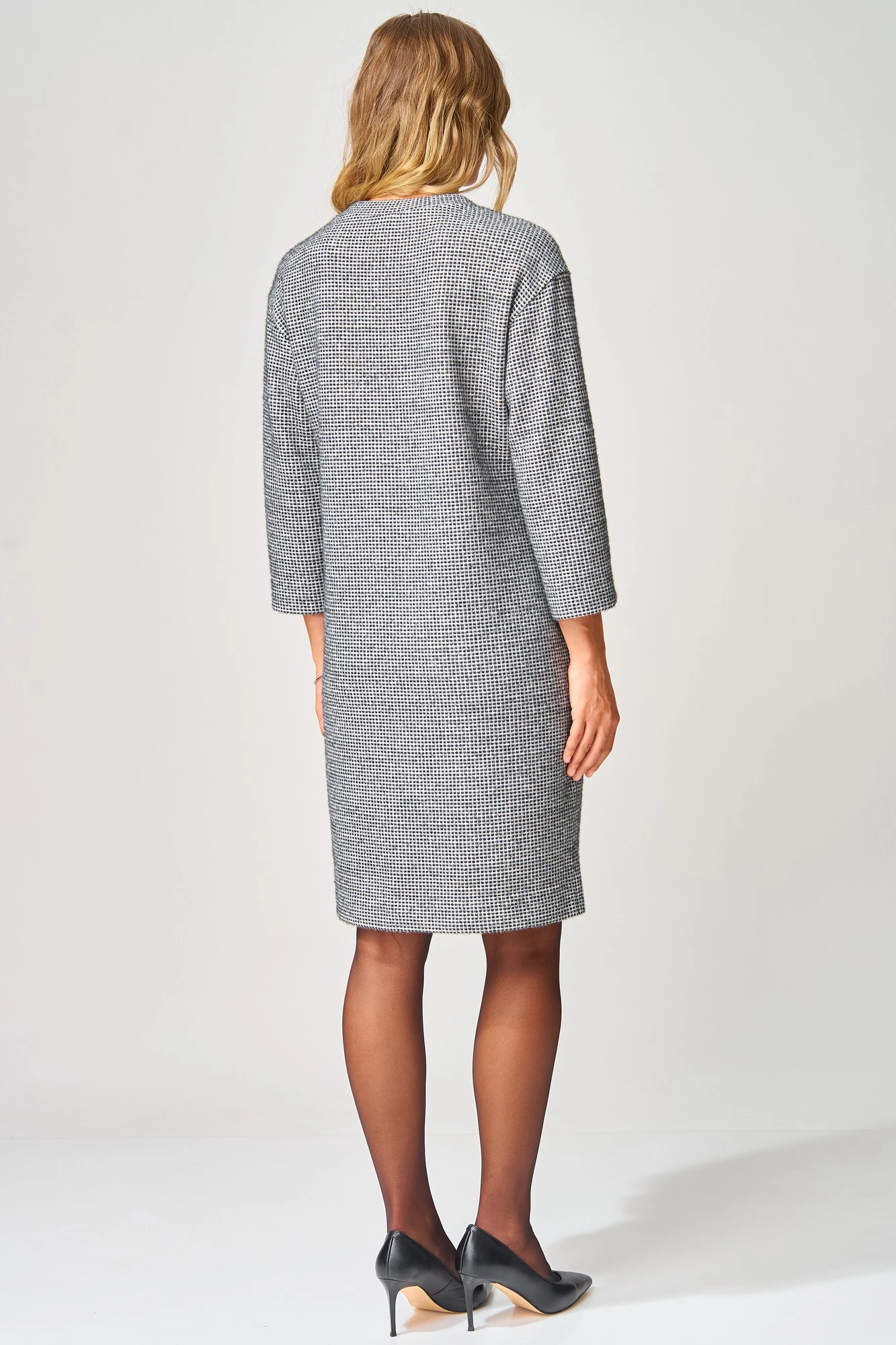 Вырез горловины округлой формы с втачной бейкой. Деталь переда с нагрудными вытачками, вверху нанесена аппликация-вышивка. Спинка цельная. Рукава втачные одношовные, длиной 3/4, линия плеча спущена. В боковых швах обработаны карманы и разрезы.