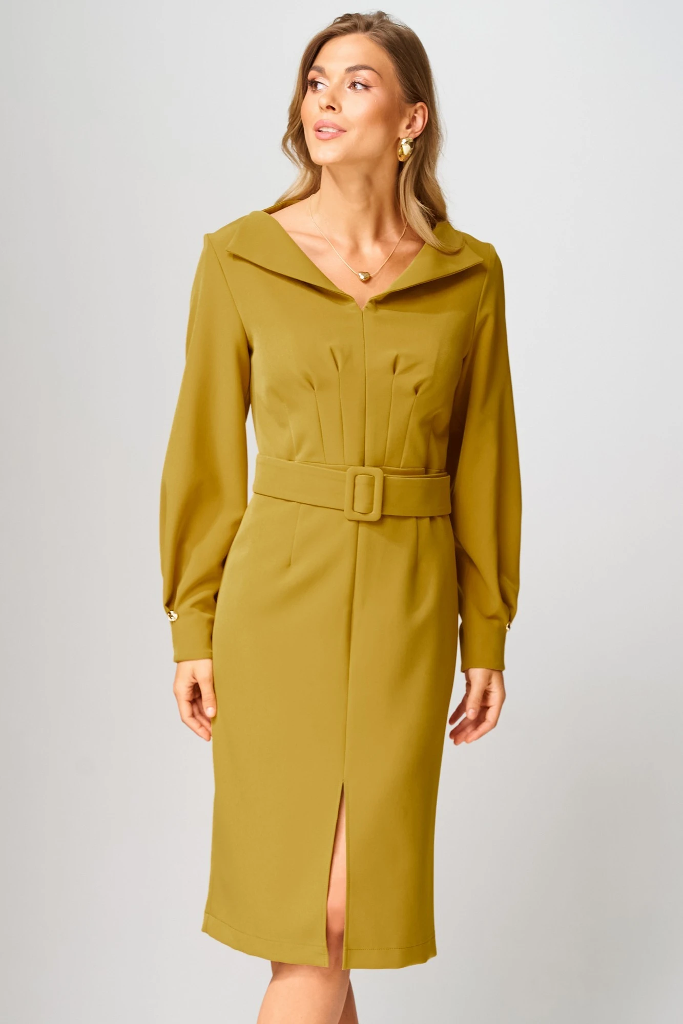 Вырез «V-образной» формы, обработан обтачкой. Перед и спинка платья отрезные по линии талии. Перед со средним швом, который заканчивается разрезом, и декоративными талиевыми вытачками. Рукава втачные одношовные, по низу обработаны по 3 складки, на которых декоративно прикреплены по 3 пуговицы. Низ рукавов обработан обтачкой. На уровне талии расположены шлевки.