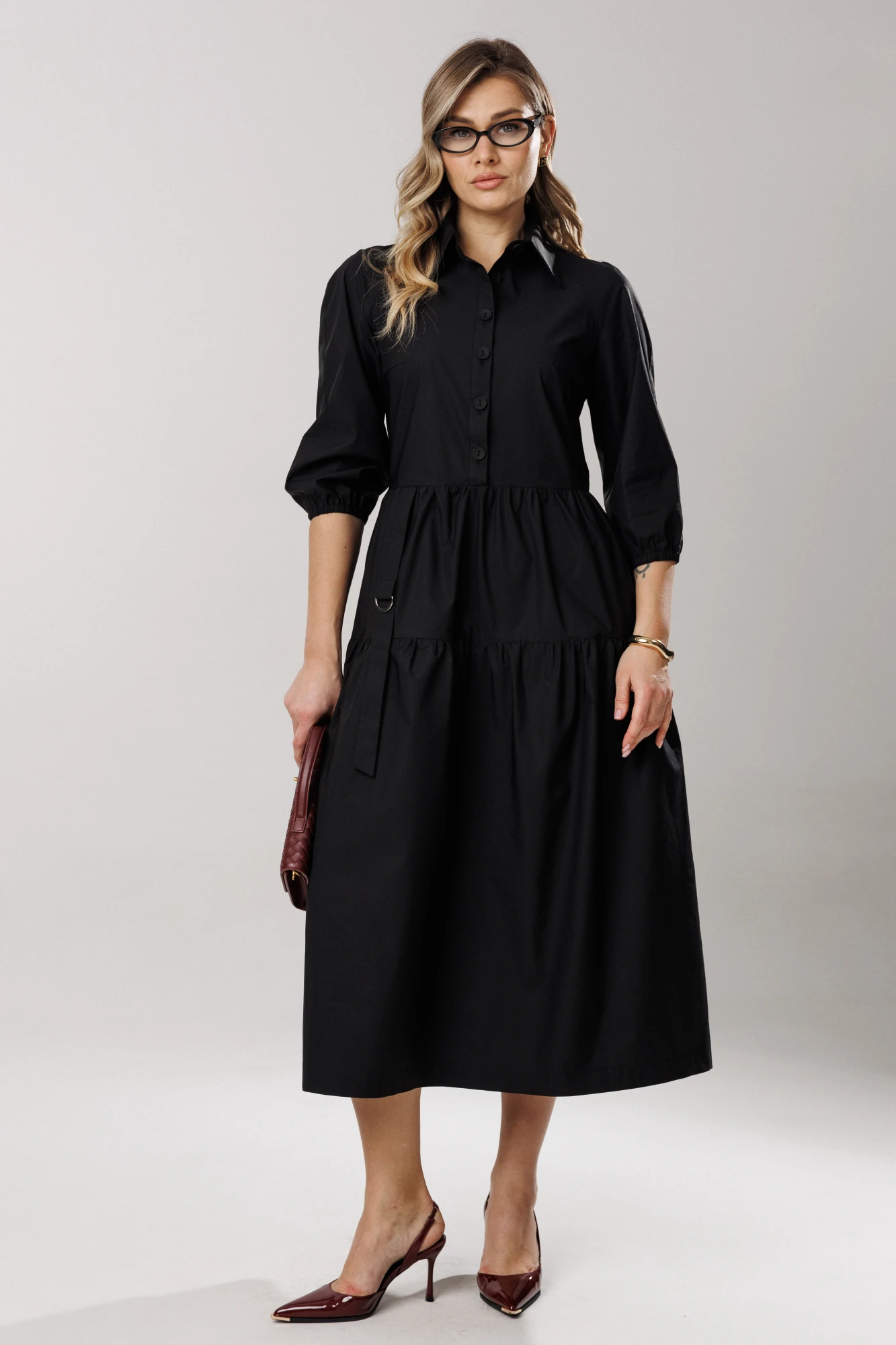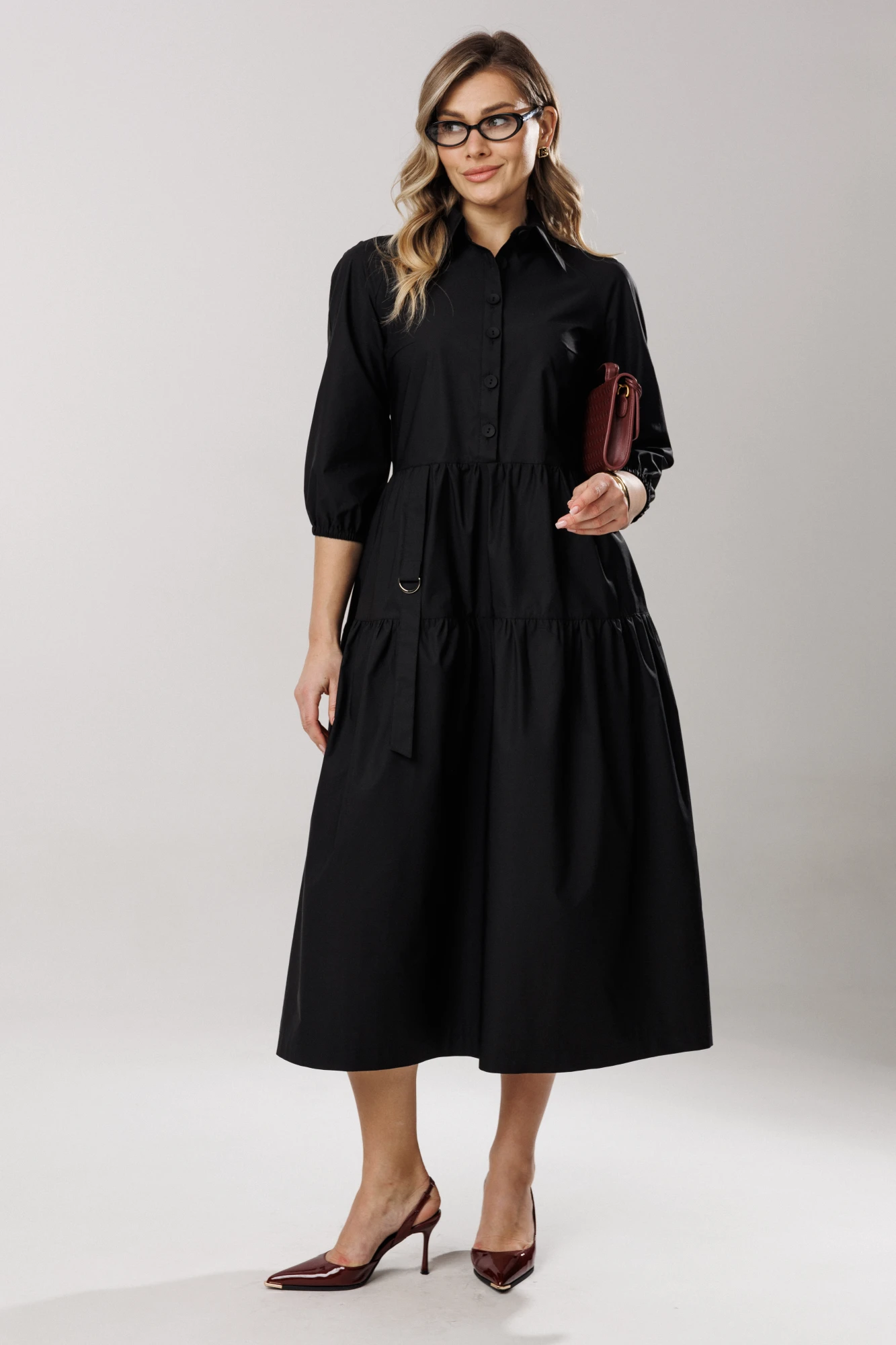 Горловина платья оформлена отложным рубашечным воротником на стойке.