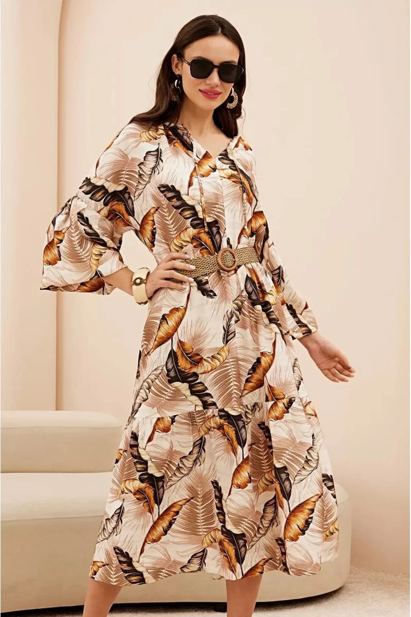 50, 52 ,54Эффектное платье в стиле «Бохо» из очень приятной принтованной ткани дополнено готовым поясом , отлично подходит для шпилек и обуви на плоском ходу. Платье А образного силуэта с притачным воланом отрезное по линии талии (на резинке). Лиф со средним швом и округлым вырезом на завязках с фиксаторами, Рукав комбинированного покроя, линия плеча приспущена, нижняя часть со складками и резинкой по низу (можно регулировать длину рукава). Съемный пояс фабричного производства завершает весь образ.