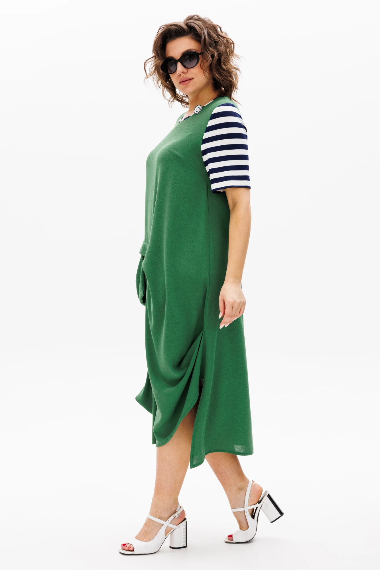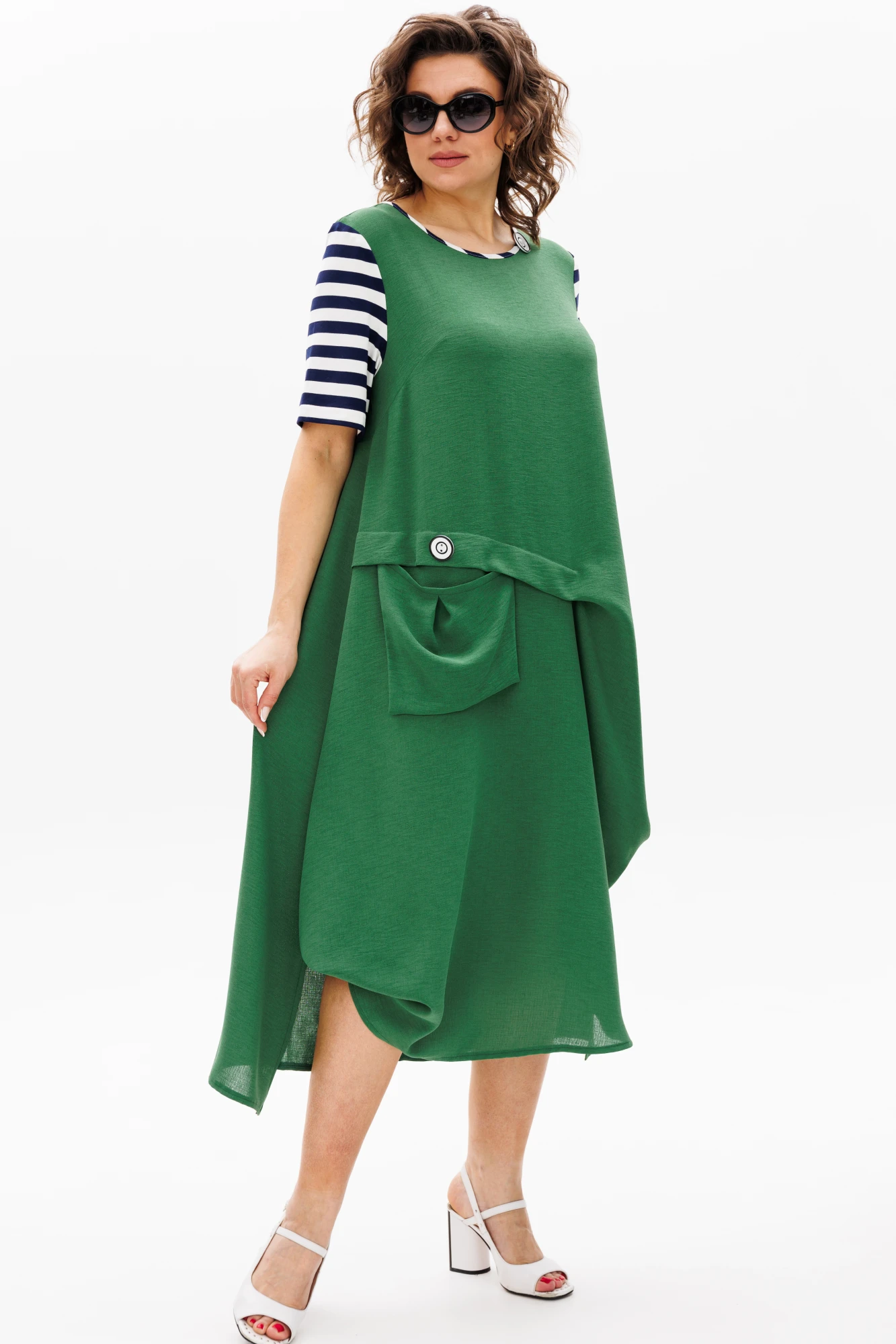 48, 50 ,52, 54 , 56 ,58,60,62,64,66, 68 , 70Универсальное и комфортное платье на любой случай вашей жизни. Платье выполнено в стиле «бохо». Платье средней длины, с круглым вырезом, с коротким рукавом. По переду изделия настрочен отлетной накладной карман-мешок. В боковом шве — разрез. Рукава платья и отделка горловины выполнены из ткани- компаньона.