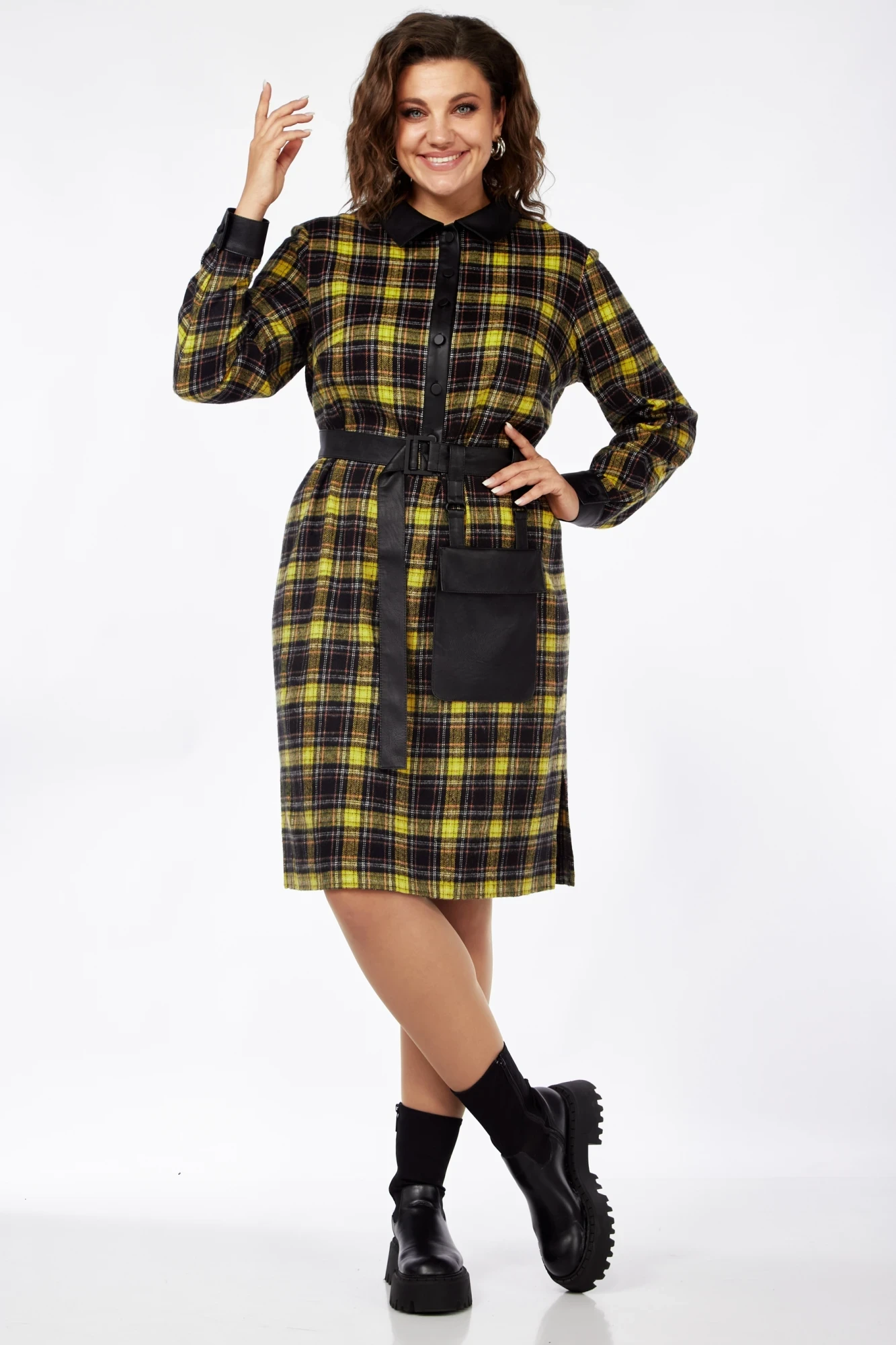 52,54, 56По переду нагрудные вытачки, отрезная планка-застежка на петли-пуговицы. Спинка прямая. Воротник отложной рубашечного типа. Рукав втачной, одношовный, на манжете с застежкой на петли-пуговицы. В комплект входит пояс из кожи со съемным отделочным карманом.