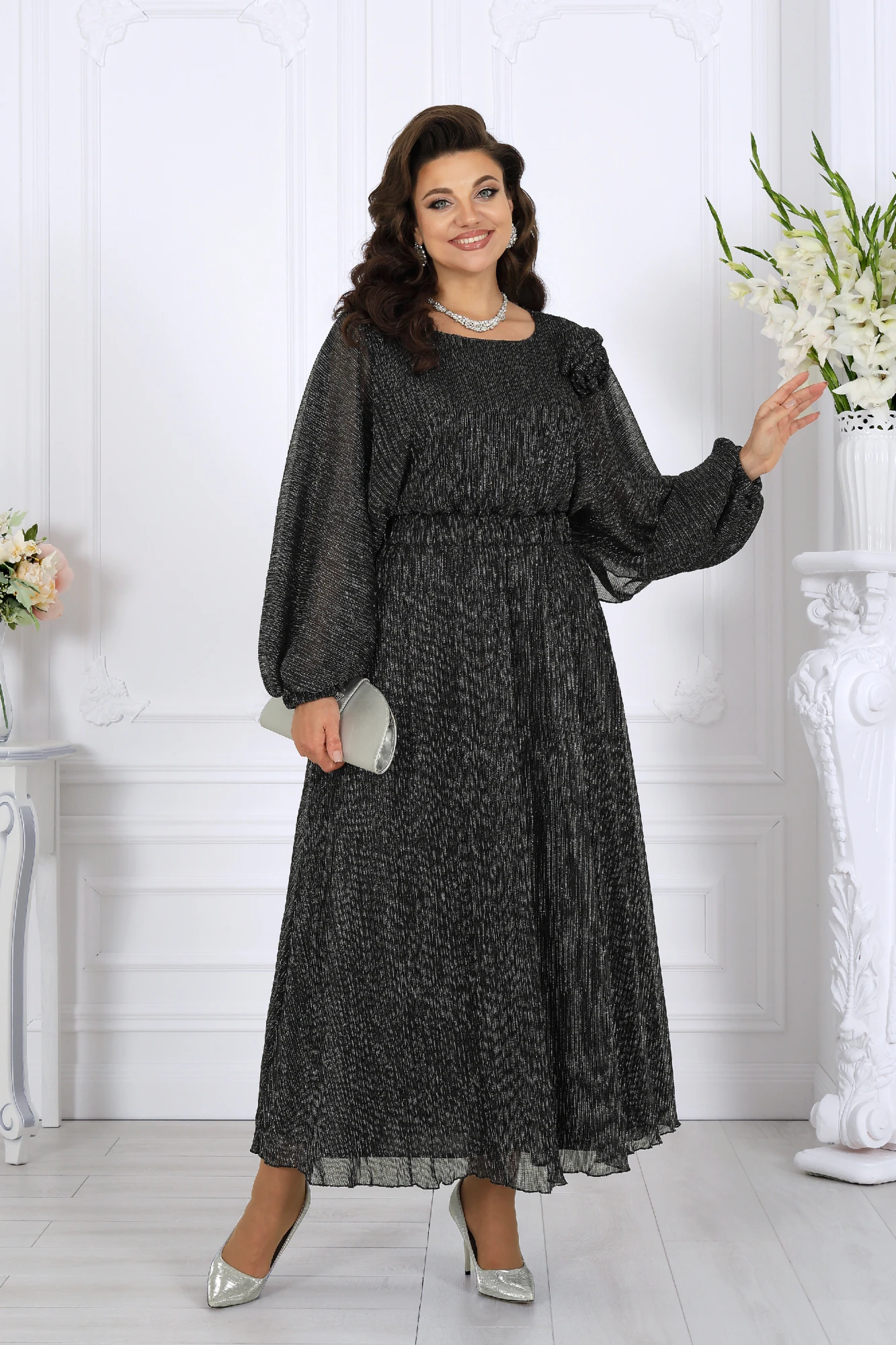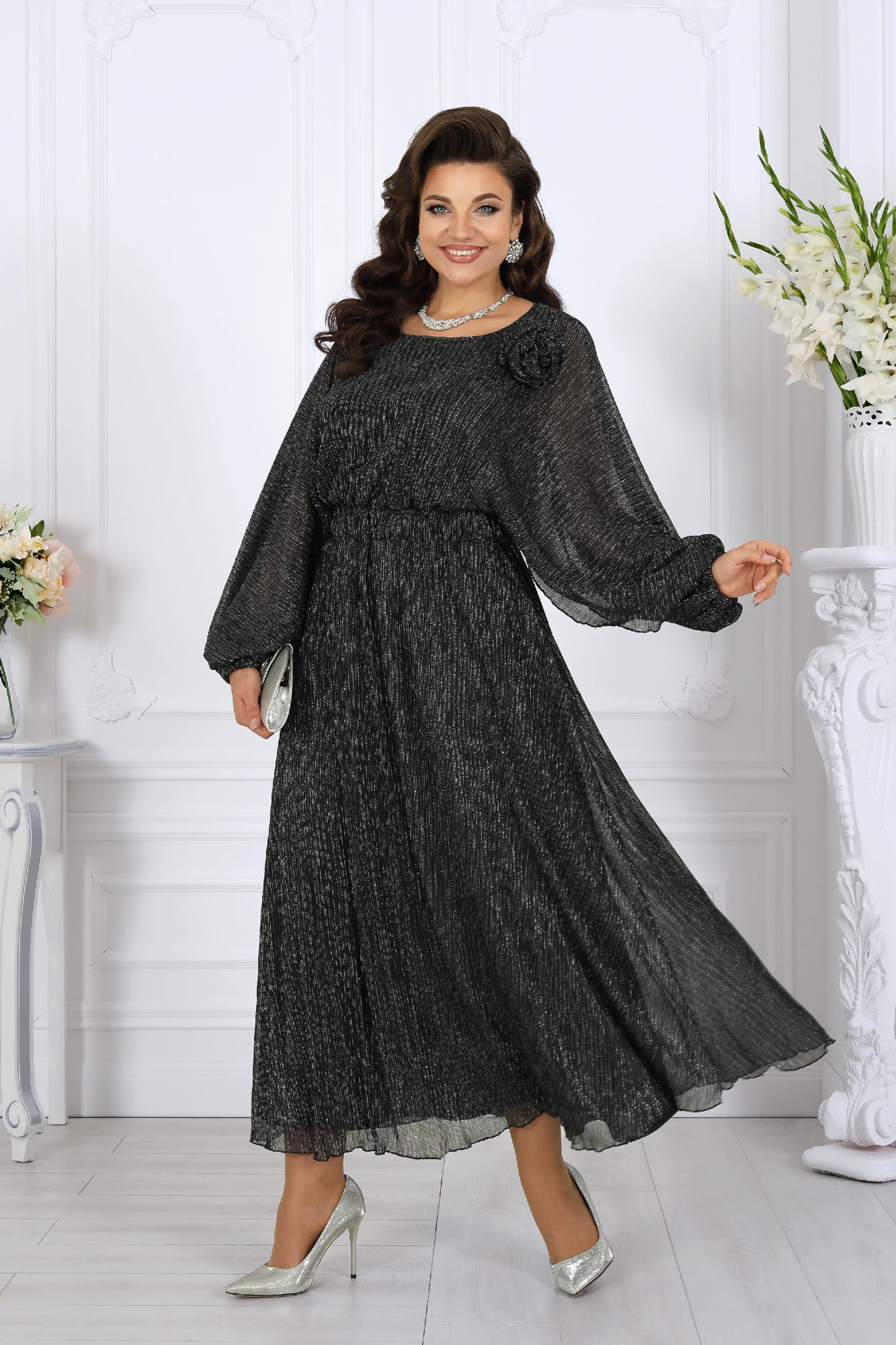 Платье женское, приталенного силуэта, выполнено из сетки-гофре с нитью «люрекс». Модель на трикотажной подкладке, без застежки и плечевых накладок. Платье отрезное по линии талии, со свободным лифом и расширенной к низу юбкой. Для лучшего прилегания в области талии в отрезном поясе предусмотрена эластичная лента, вставленная по всей длине. Лиф цельнокроеный с рукавами, без боковых швов -- с разрезами от талии до манжет. Для регулирования длины рукава внутрь манжеты протянута эластичная лента. Горловина округлая, окантована узкой косой бейкой из основного материала. Платье дополнено съемным «цветком» з основного полотна.