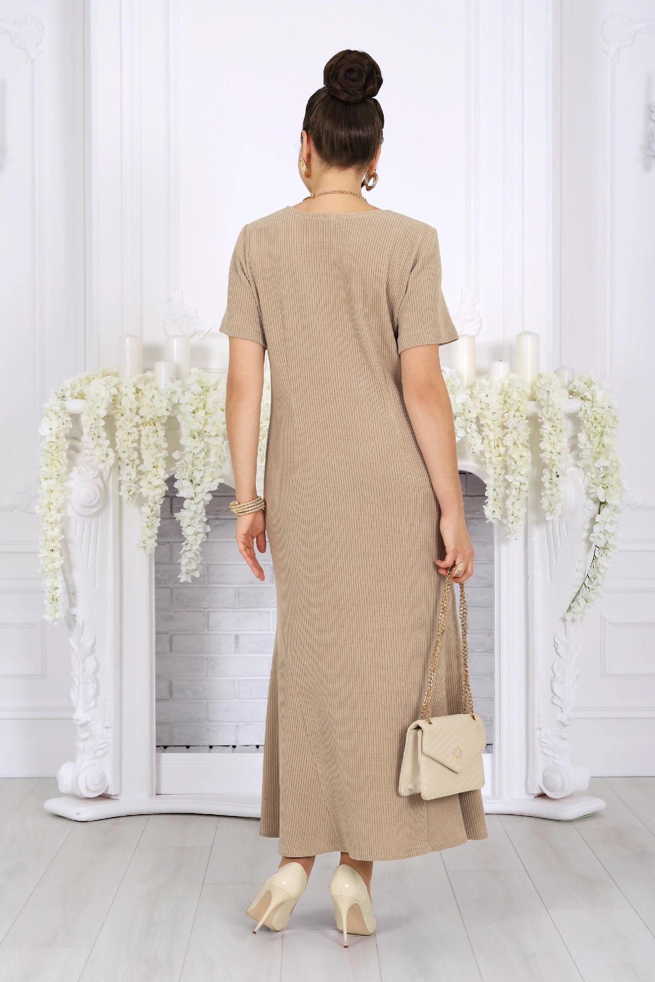 Платье полуприлегающего силуэта, выполнено из фактурного трикотажного полотна с рубчиком. На продолжении боковых швов, в нижней части платья – притачные клинья, придающие силуэту расширение к низу. Модель без подкладки, без застежки и плечевых накладок. Перед с нагрудными вытачками, направленными от пройм, спинка – с талиевыми. Горловина круглой формы, углубленная спереди. Рукав втачной, короткий.