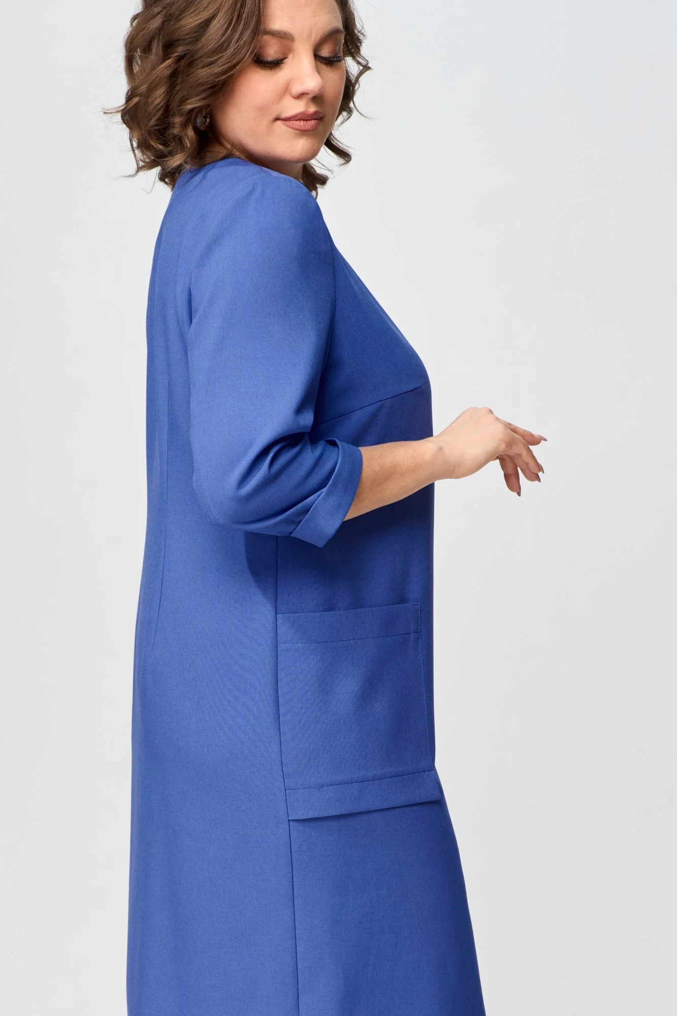 По переду платье ассиметричное: в левой части переда расположена отлетная кокетка до уровня талии с деталями в области плеча из отделочной ткани, в правой части в области бедер расположен накладной карман. Дополнением платья служат пуговицы в цвет отделки.