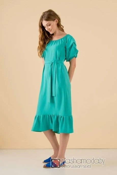 Платье женское из тонкой плательной ткани ткани свободного покроя. Вырез горловины- на резинке, что позволяет носить изделие в разных вариантах. Рукава покроя реглан с буфами. Низ рукавов- с легкой сборкой, оформлен притачными манжетами. В боковых швах имеются карманы. По низу платья- притачной волан. Изделие дополнено съемным поясом из основной ткани.