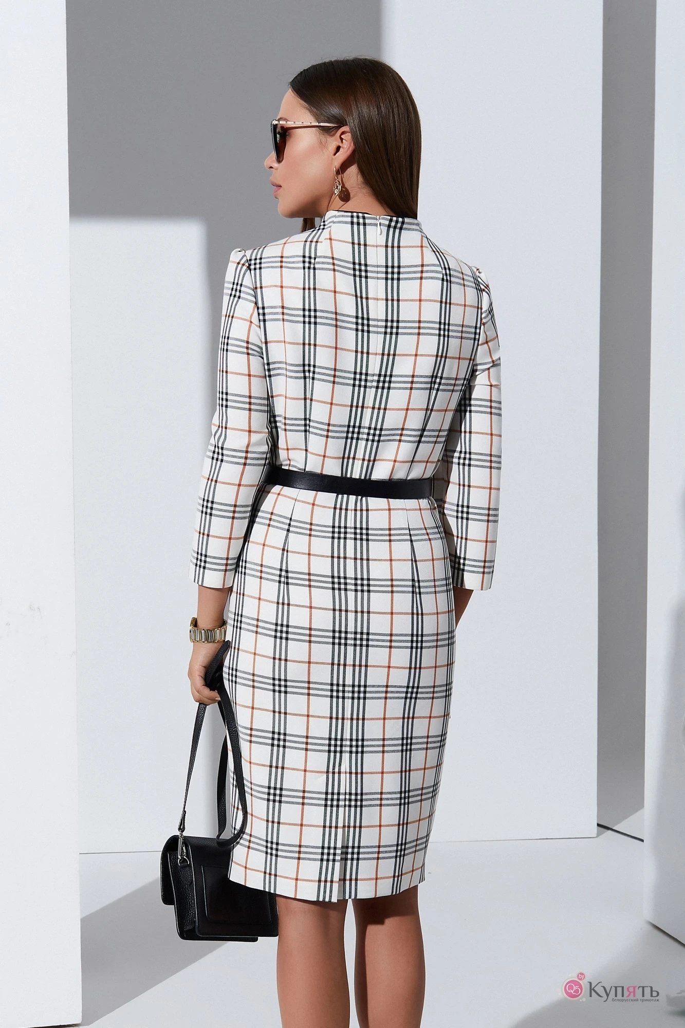 Платье с воротником - стойкой и съёмным ремнём по талии. Перед с декоративной деталью с пуговицами от среднего шва. Спинка с талиевыми вытачками, потайной молнией и шлицей в среднем шве. Рукава втачные.