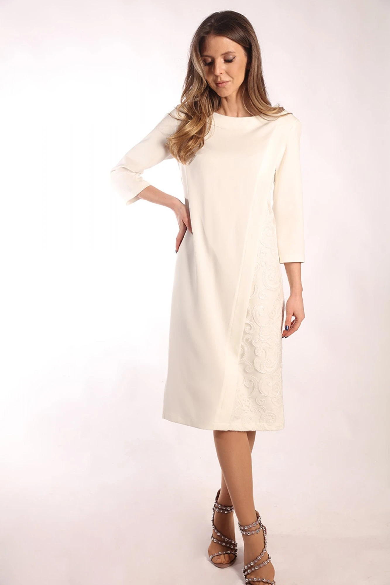 За счёт красивого декора в виде накладного кружева платье будет отличным вариантом на торжество. Укороченные рукава и простая полукруглая горловина придают платью классический вид.