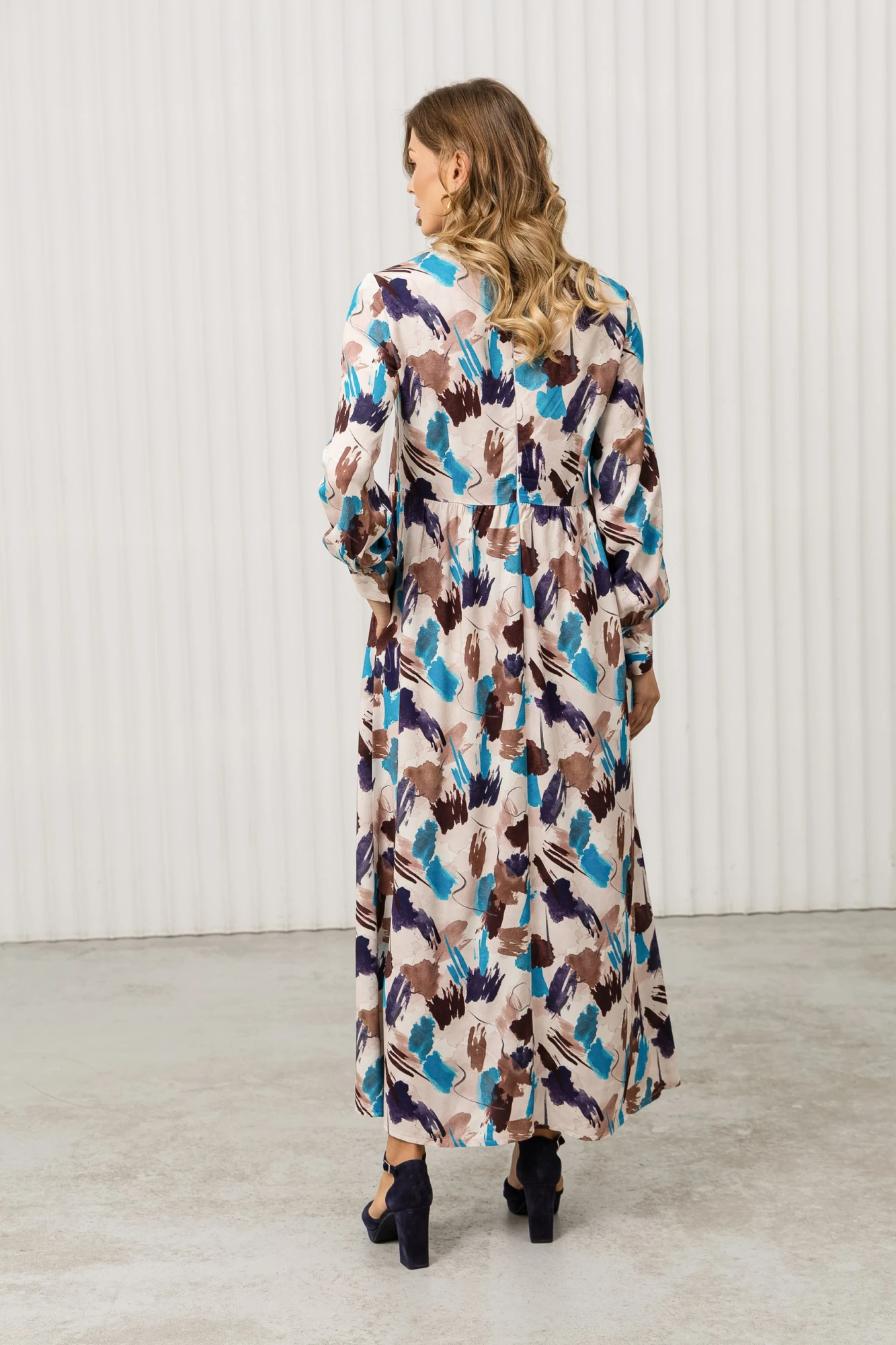 Дизайн: платье-рубашка с длинными рукавами, воротником и застёжкой на пуговицы. Пояс на талии подчёркивает фигуру, придавая образу женственность и изысканность;