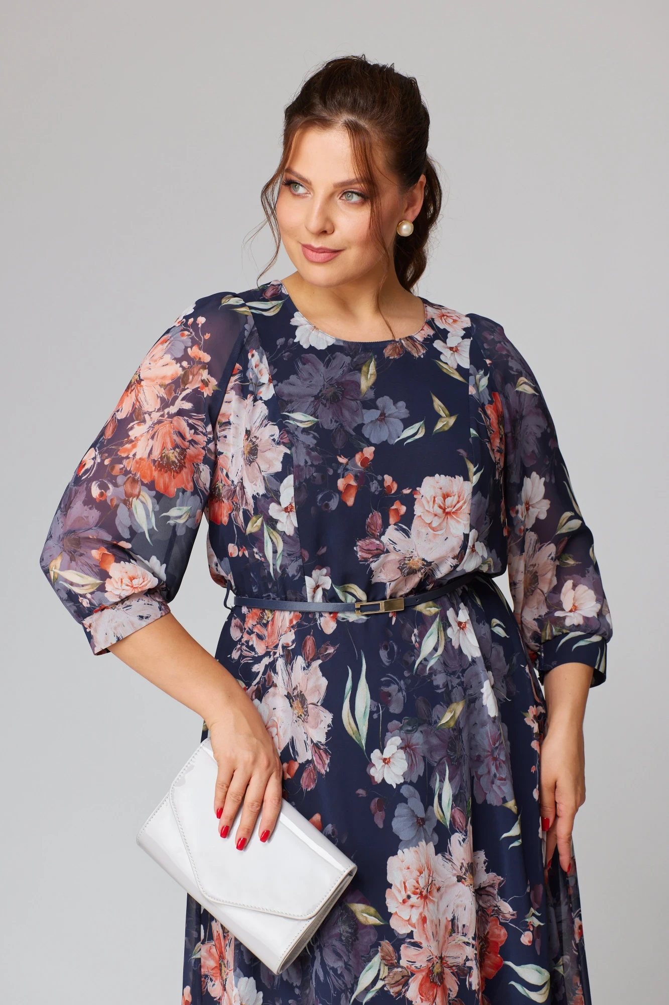 Платье СлавияЭлит 534-1 синий + пудра цветы