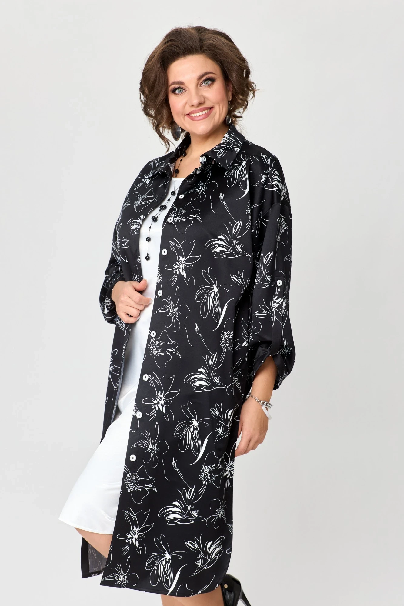 60Платье состоит из удлинённой рубашки с отложным воротником. По передней части планка, застежка-пуговицы. Свободный крой, по бокам фигурные подрезы. Вторая деталь этого наряда - имитация платья. То есть передняя часть платья однотонного черного цвета вшита по боковым швам в саму рубашку и создается впечатление, что наряд двухпредметный. В расстёгнутом виде смотрится как платье и поверх надета рубашка. Однотонная часть платья выполнена из мягкой и приятной ткани . Ткань цветная на вид как плотный атлас.