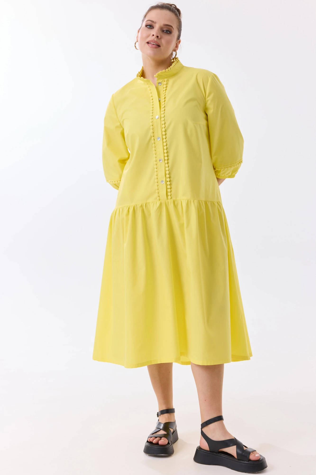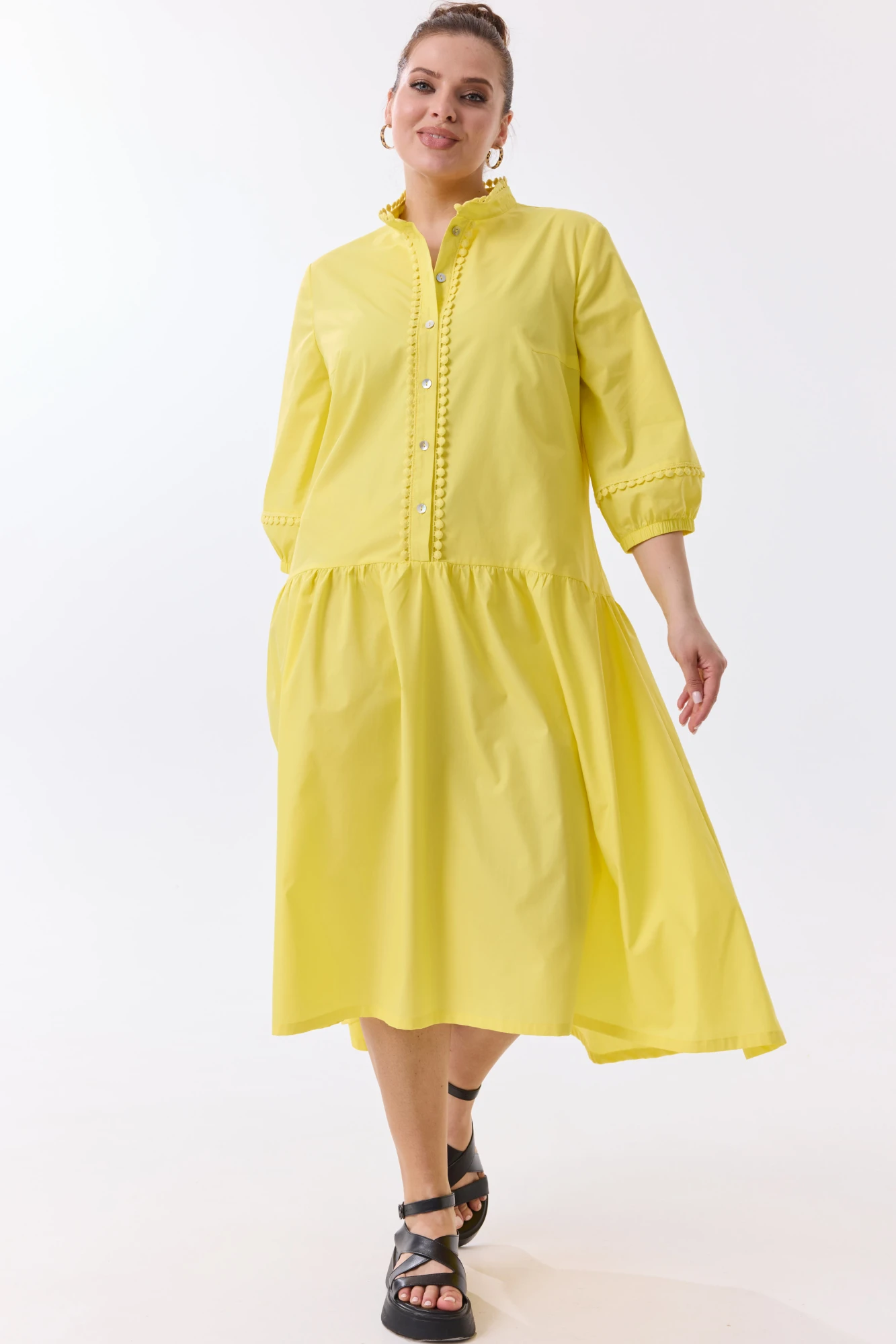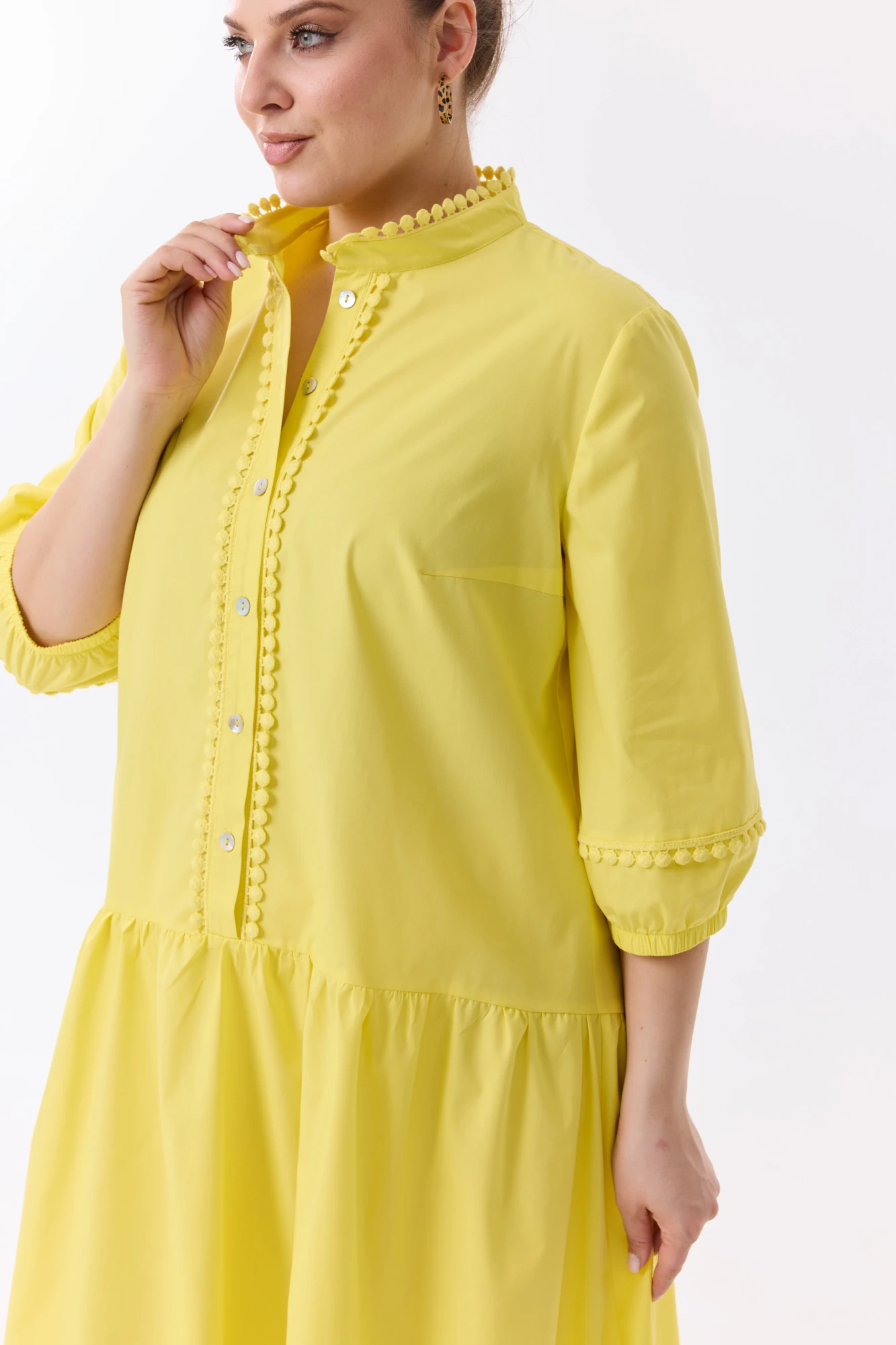 Верхняя часть платья рубашечного типа, декорировано платье лентой.