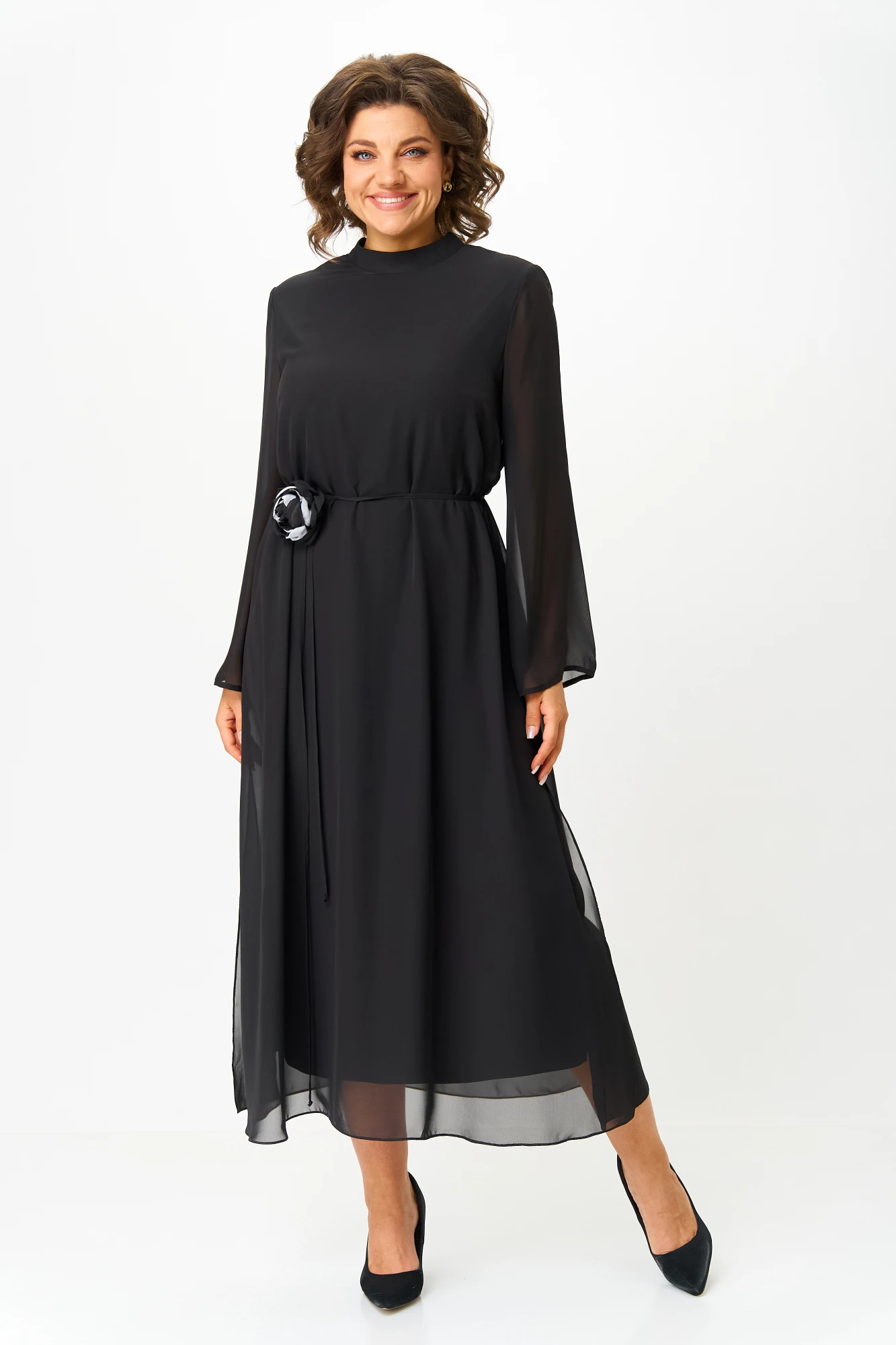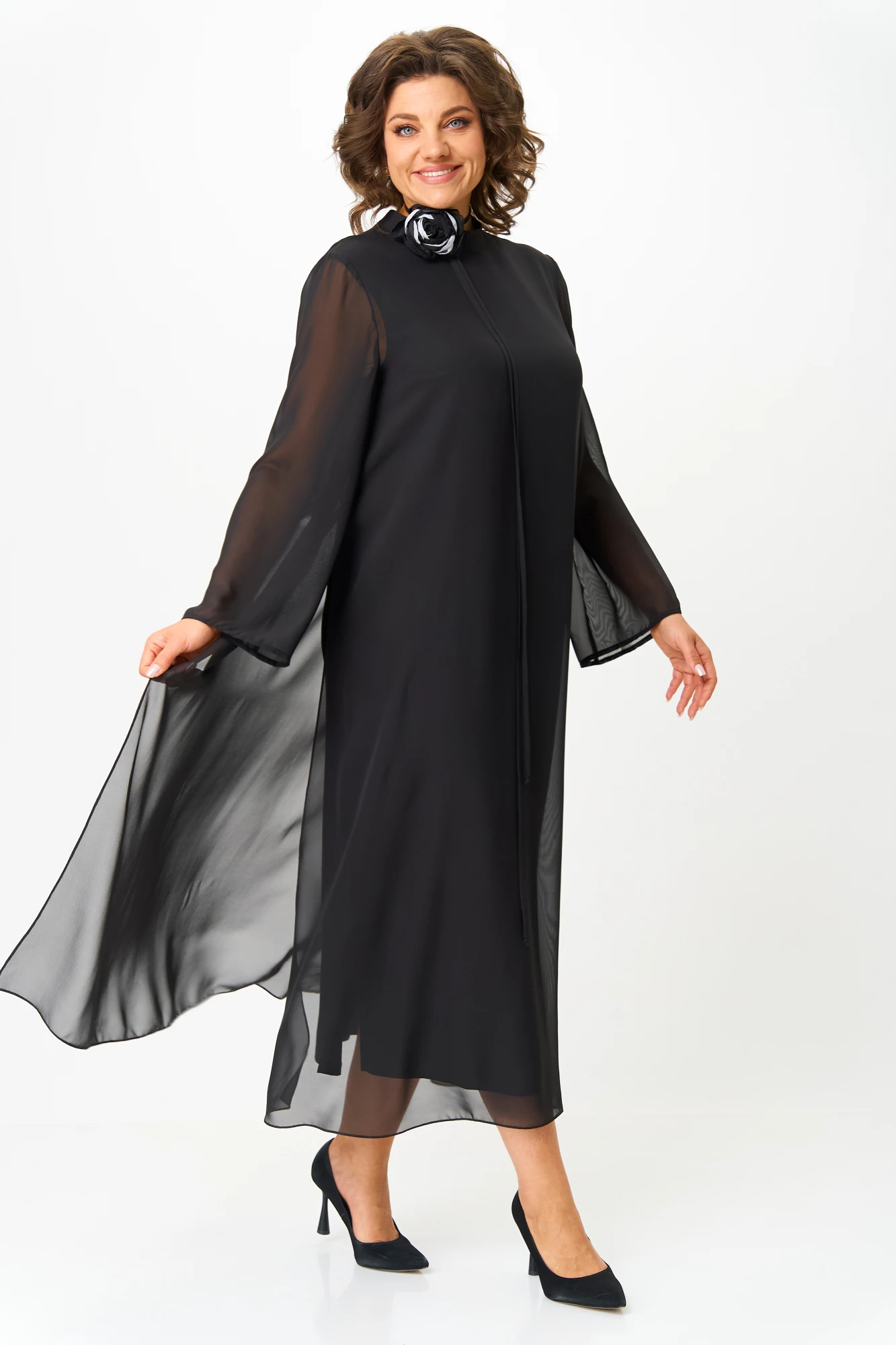 Верхнее платье из шифона свободного кроя расширено к низу, с втачным рукавом. По горловине воротник стойка с застежкой по спинке на две воздушные петли и пуговицы. Рукав длинный расширенный к низу. В боковых швах высокие разрезы.